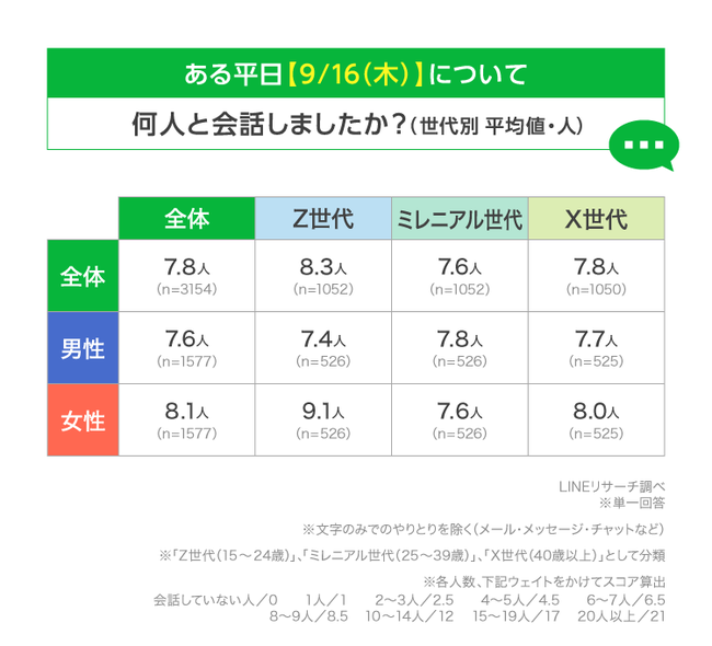 【LINEリサーチ】特定の平日における消費やコミュニケーションなどを定点的に調査する「ある平日シリーズ」を公開開始 9月第3木曜に会話をした人数はZ世代が最多、買い物は世代が上がるほど増加傾向