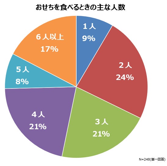 2026年のおせち料理を食べる人数について1位は「2人」(24%)、次いで2位「3人」(21%)、「4人」(21%)同数となりました。また「6人以上」と回答した方は17%でした。「6人以上」と回答した方を年代別で見てみますと70歳代以上が24%、30代は26%と他の世代と比較して数値が高い結果となりました。ご家族や親族とともにおせち料理を囲んでいる傾向がうかがえます。