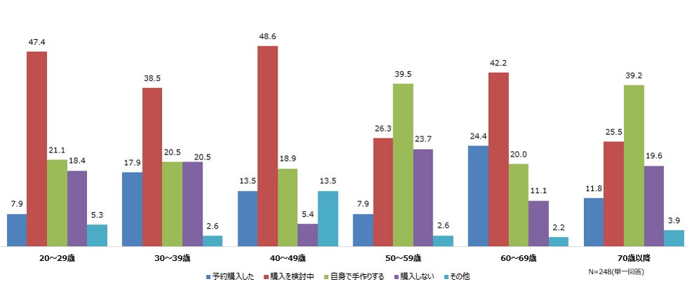 2026年のおせち料理の準備については、「予約購入した」(14%)とおせち料理の購入を予定している「購入を検討中」(37%)と合計51%という結果になりました。年代別に見てみると、50~59歳と70歳以降は「自身で手作りする」が約4割で、50歳未満の半数以上は、「予約購入した」、「購入を検討中」という結果になりました。