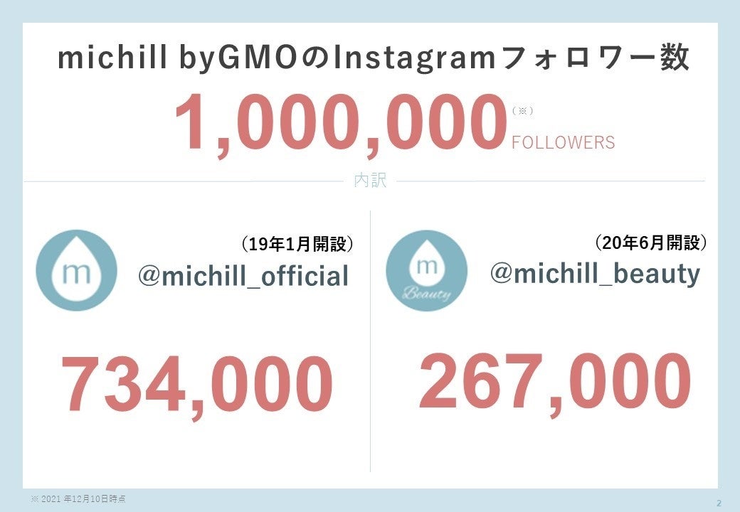 20〜30代の女性向けライフスタイルメディア「michill byGMO」が運営する2つの公式Instagramアカウント(@michill_official、@michill_beauty)のフォロワー数が、合計100万人を突破いたしました。