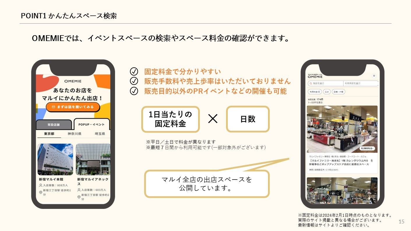 マルイ店舗への出店の検討から問い合わせ、契約までの手続きがオンラインで完結できるマルイの出店サービス『OMEMIE』の展開をしています。