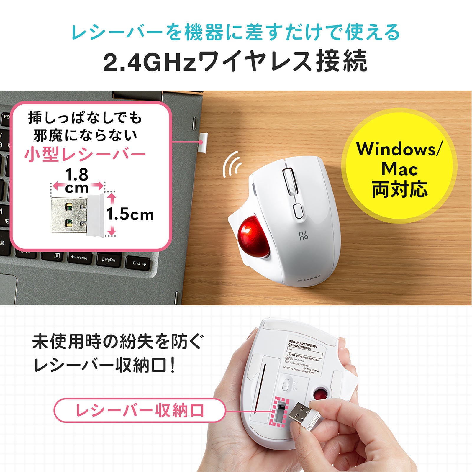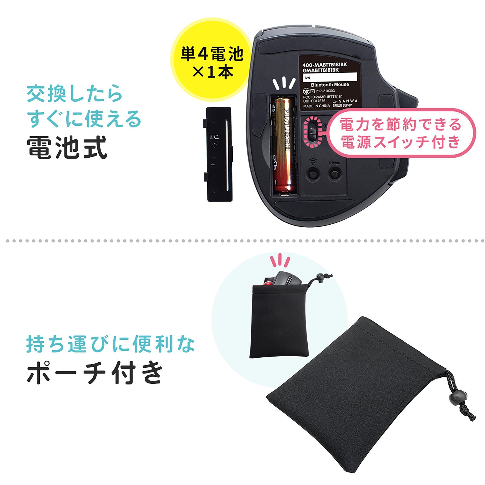 本製品のサイズは約W75.2×D95.7×H42.4mm、 重量は約89.5g(電池含まず)です。 専用レシーバーを使わずにパソコンと接続できるBluetooth接続タイプの400-MABTTB181シリーズもあります。