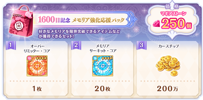 ※「1600日記念 メモリア強化応援パック」のご購入はおひとり様2回までです。