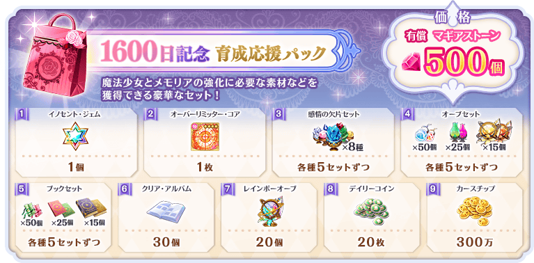 ※「1600日記念 育成応援パック」のご購入はおひとり様1回までです。