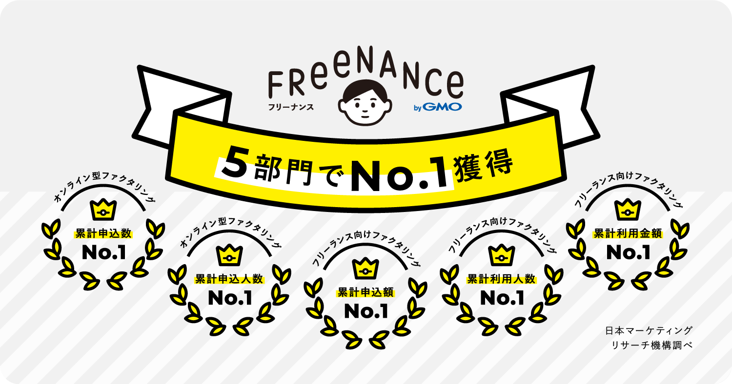 GMOインターネットグループのGMOペパボ株式会社(代表取締役社長:佐藤 健太郎)の連結会社であるGMOクリエイターズネットワーク株式会社(代表取締役社長:伊藤 毅 以下、GMOクリエイターズネットワーク)が運営する、日本初のフリーランス(※1)に特化した金融支援サービス「FREENANCE(フリーナンス) byGMO」(URL:https://freenance.net/)は、株式会社日本マーケティングリサーチ機構が行った、フリーランス向けファクタリング・オンライン型ファクタリングを対象とした調査において5項目でNo.1を獲得しました。