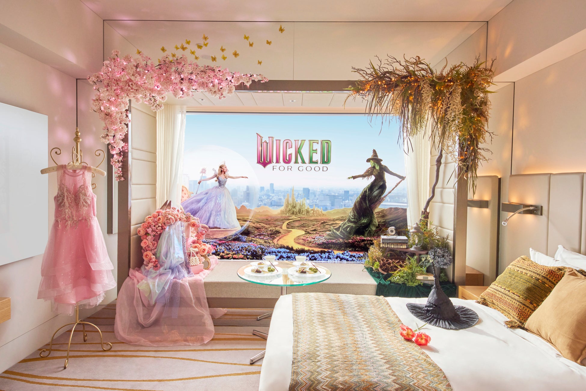 映画『ウィキッド 永遠の約束』とのコラボレーションステイプラン。グリーンの木々とピンク色に咲き誇る桜が東京の絶景を望めるお部屋の窓一面を飾り、劇中に登場するふたりをイメージしたアイテムがお出迎え。本プラン限定のスペシャルスイーツとともに、お部屋で映画の世界観を存分にお楽しみいただけます。