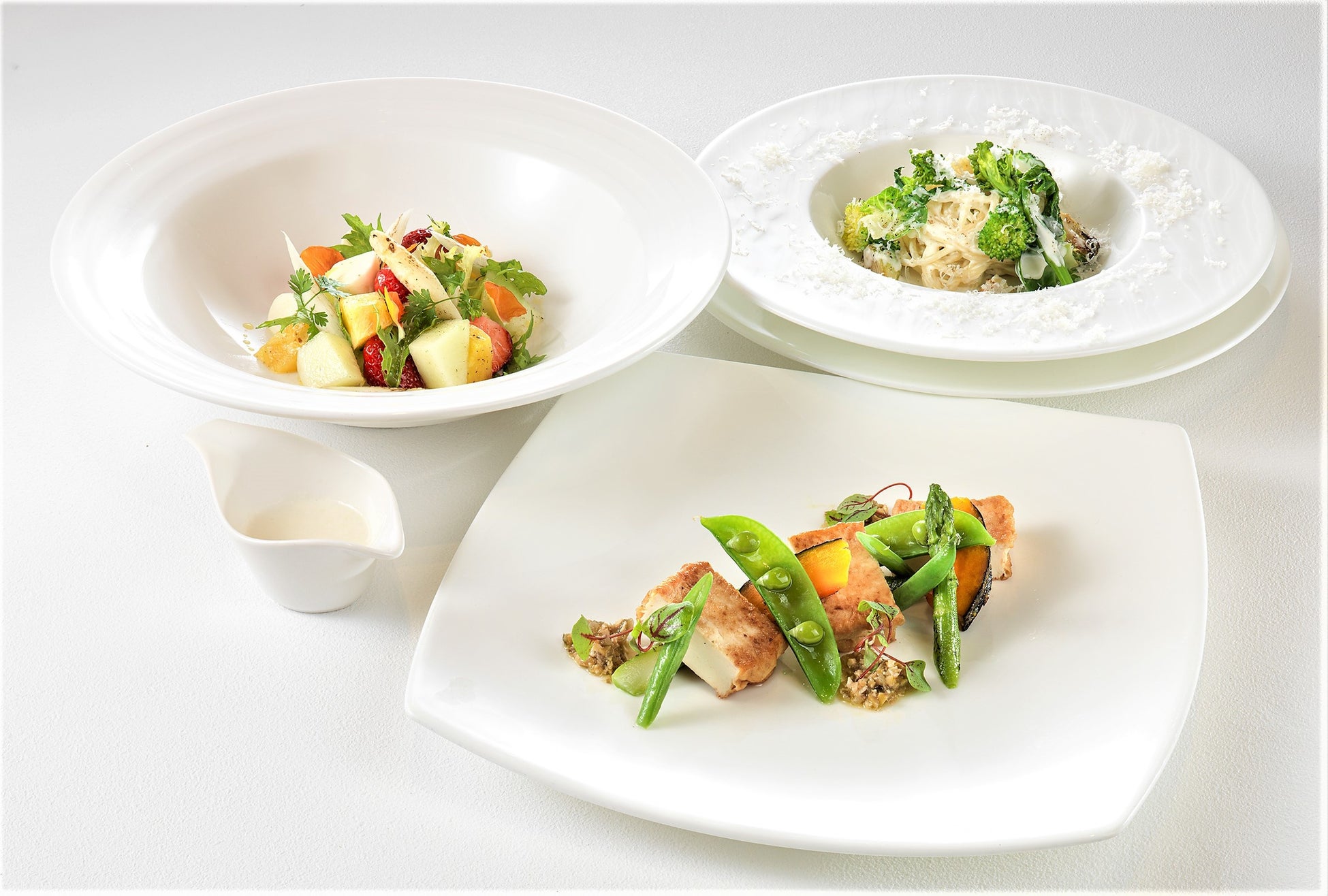本コースの前菜は、兵庫県産野菜とモッツァレラチーズのサラダ。8種類の色鮮やかな野菜やフレッシュフルーツにクリーミーなチーズ、さらに自家製の淡路産オニオンドレッシングの華麗なハーモニーが広がります。続いては、手間と時間をかけて育てられた甘くて柔らかい淡路島玉ねぎを贅沢に使った二皿、「ロワイヤル」と「サンジェルマン」。玉ねぎの甘みが広がるロワイヤルには、香り高い茸のデュクセルソースを合わせました。爽やかな緑が目を引くサンジェルマンは、グリンピースと玉ねぎの甘みを最大限に引き出した濃厚なスープです。季節野菜のクリームソースが絡む淡路産デュラム小麦のスパゲティは、野菜の優しい味わいとクリーミーなソースの相性が抜群。ヘルシーでありながらも満足感のある一皿です。