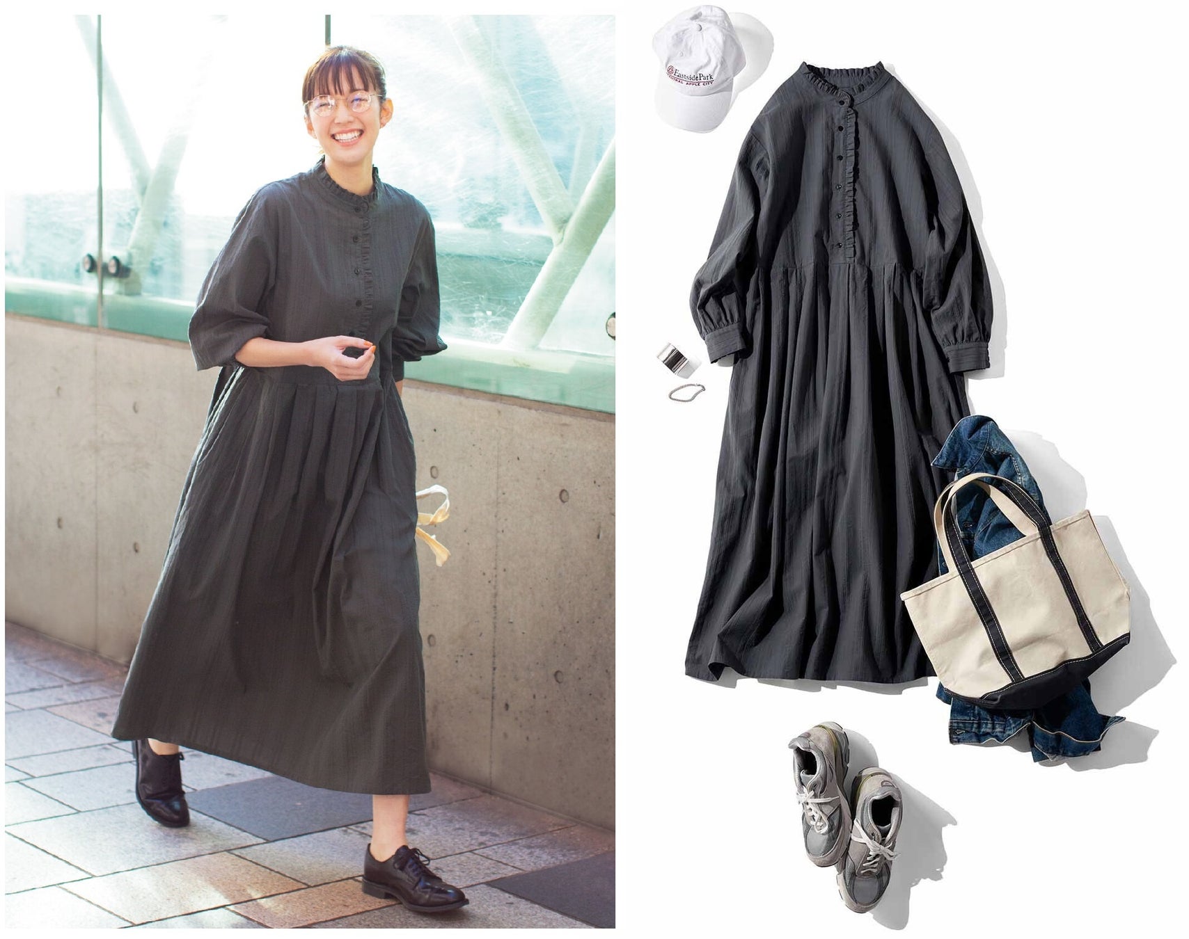 栞里ちゃん×リブインと言えば、やっぱりワンピースです。空気をはらんでふわっと揺れるシルエットに、フリル遣いで“ひとさじの甘さ”をプラスしています。上品なかわいらしさと大人っぽさのバランスがちょうどいい一枚です。小ぶりなフリルをスタンドカラーと前立ての片側だけにあしらい、スミクロのコットン生地には、細かいストライプの織り柄が入っていて、遠目からだと無地っぽいけど、近くで見ると柄がある遊び心がポイントです。いろいろなコーデができて、辛口な服が好きな人にも甘い服が好きな人にも寄り添ってくれるワンピースです。