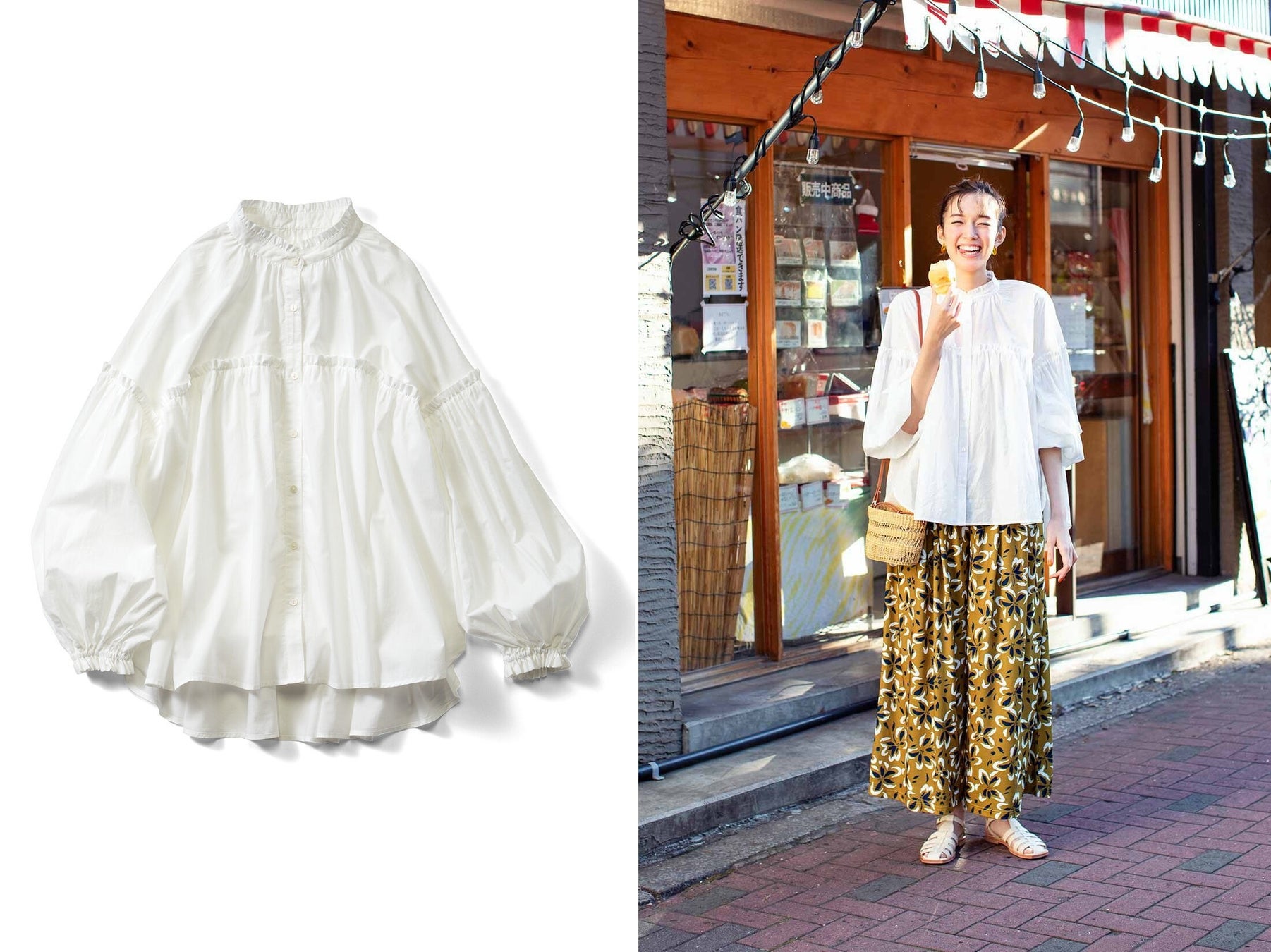 身ごろと袖のたっぷりギャザーとフリルが春らしい華やかさのブラウスは、軽やかな薄手のコットン素材でさわやかな雰囲気です。シルエットやディテールは大人にちょうどいい甘さです。きれいめなパンツだけでなく、デニムなどのカジュアルなボトムスに合わせると、さらに気負わず楽しめます。