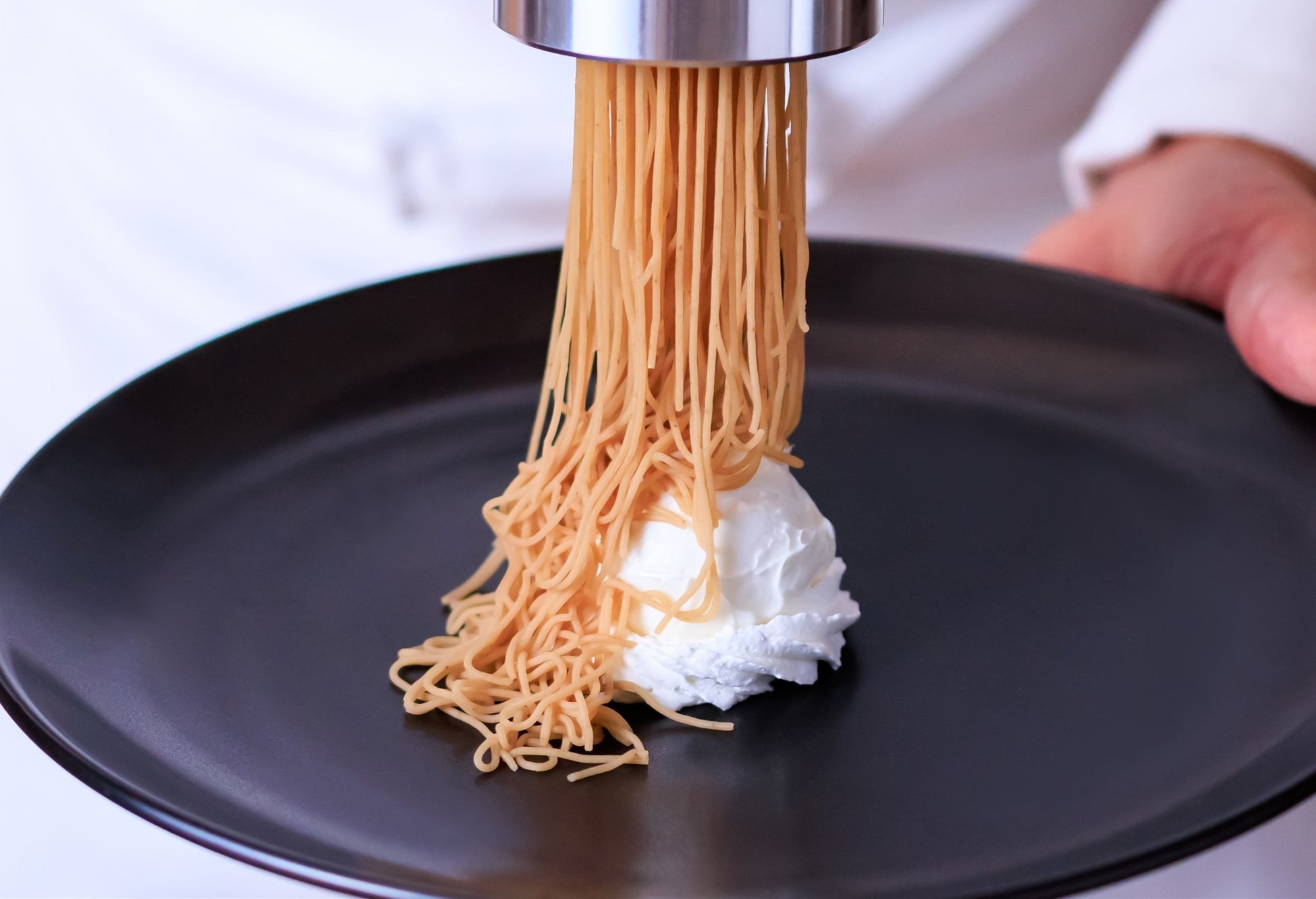 絹のようななめらかでふんわりとした食感とリッチな味わいが魅力の「生搾りアイスモンブラン」は目の前で出来立てをご提供しますので、絞りたての瞬間を楽しめる、わくわく感あふれる一品です。