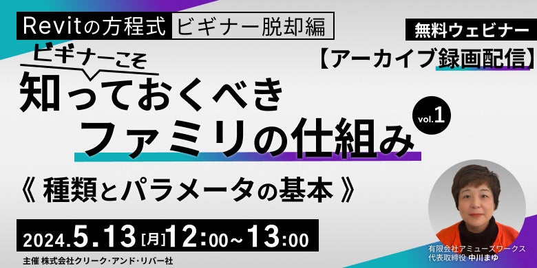 株式会社クリーク・アンド・リバー社(C&R社)は5月13日(月)、昨年8月に開催したオンラインセミナー「Revitの方程式・ビギナー脱却編_ビギナーこそ知っておくべきファミリの仕組み vol.1 ~種類とパラメータの基本~」のアーカイブ映像を無料配信します。なお、本セミナーは、Revitの使用経験が比較的浅めのBIMオペレーターや設計者の皆さまを対象とした内容で、当日は12:00~の1回配信予定です。