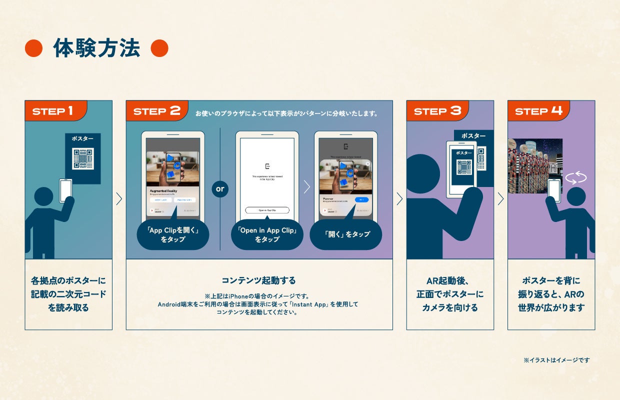 -体験の際の注意点-・体験中は周囲の安全を確認し、歩きスマホは控えてください。また、他のお客様や歩行者の妨げにならないようご注意ください。・推奨環境はiOS13以降、Android7.0以降です。また、こちらを満たしていても通信環境や端末によってうまくARが起動しない可能性があります。・本コンテンツは、Zapparアプリの機能をiPhoneのApp Clip、AndroidのInstant Appで利用しています。・ご使用のデバイス・環境によってコンテンツが消える可能性があります。・コンテンツは予告無く終了、内容変更をする場合があります。予めご了承ください。