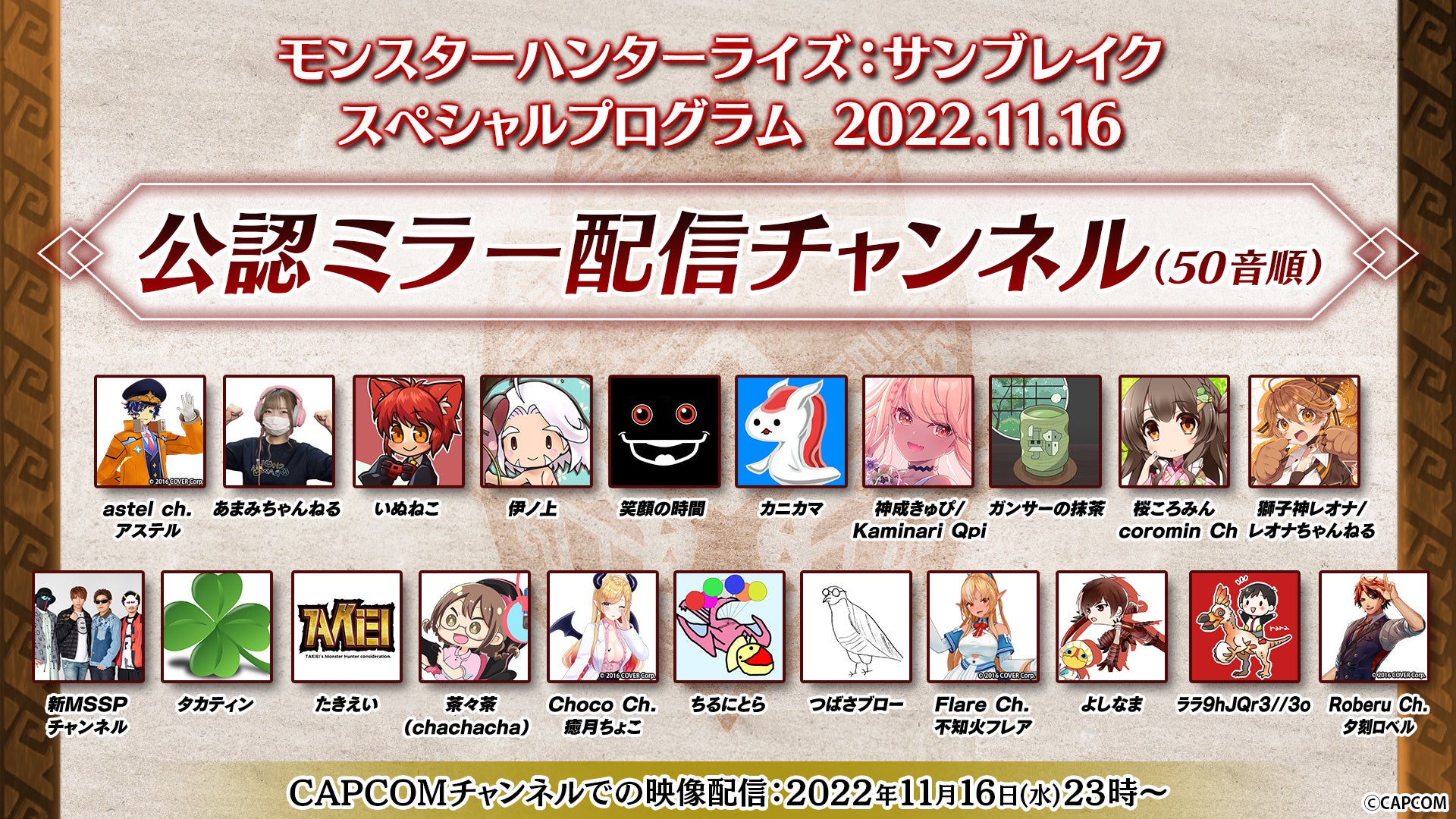- 【特別企画】「モンスターハンターライズ:サンブレイク スペシャルプログラム 2022.11.16」公認ミラー配信 YouTubeチャンネル(50音順・敬称略)