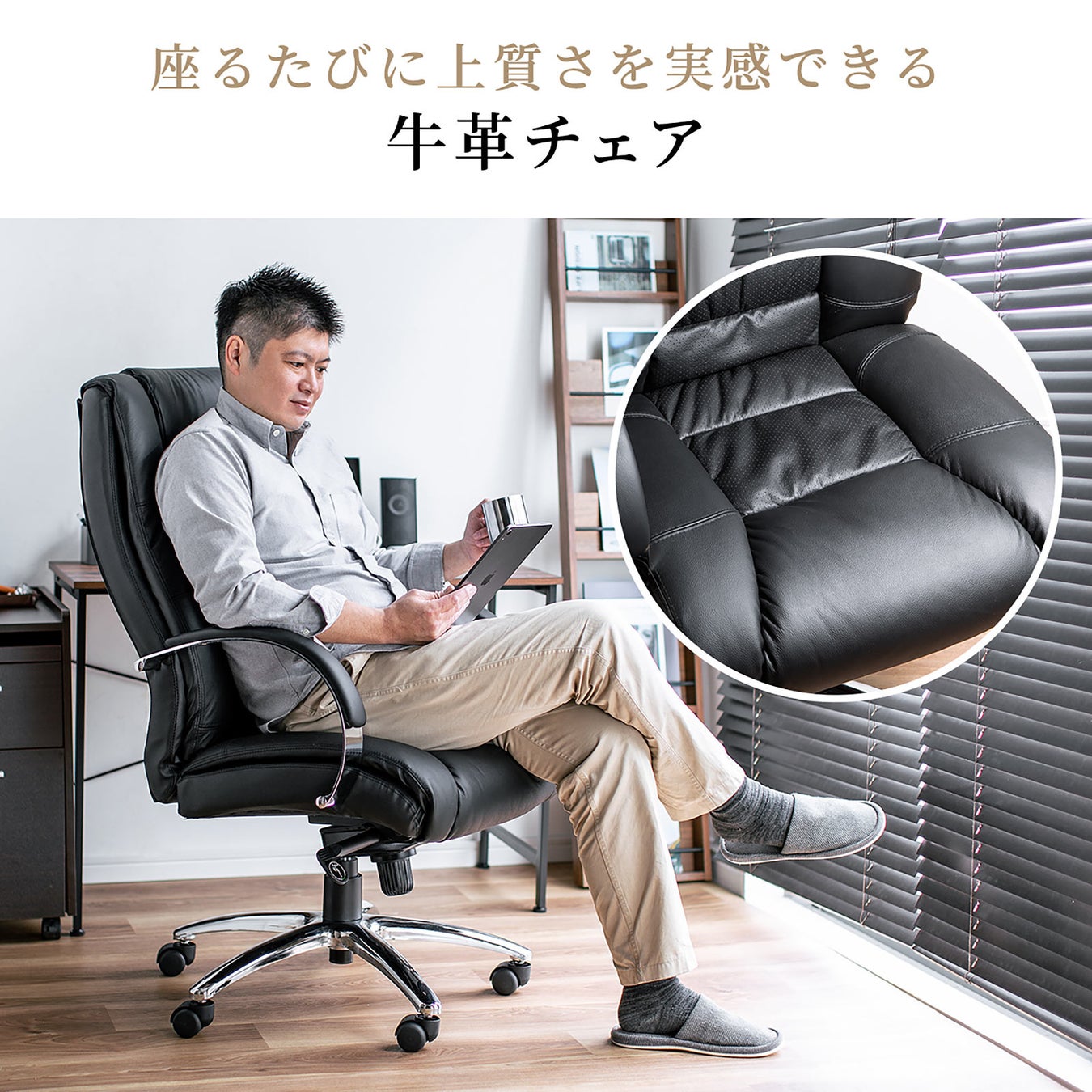 本製品は、牛革とスチールフレームを組み合わせた本格的なレザーチェアです。