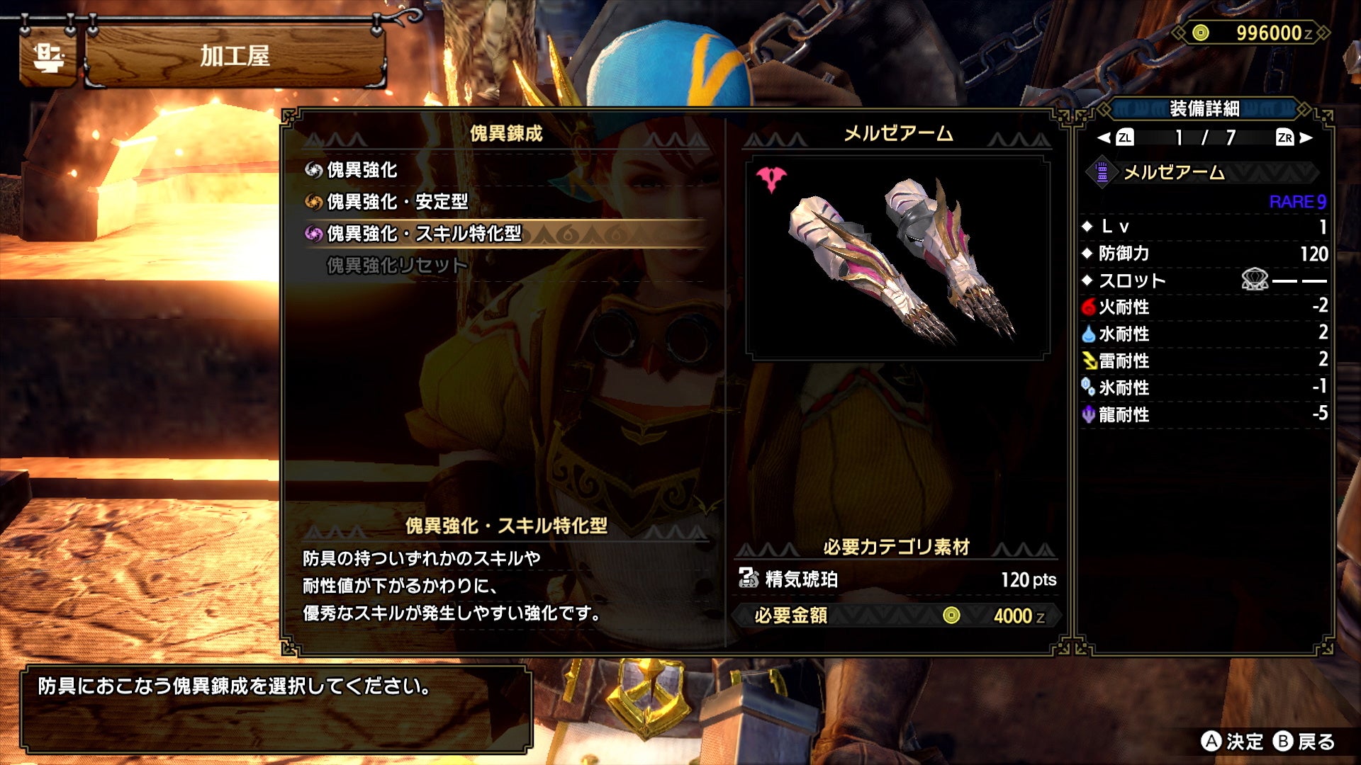 防具の持ついずれかのスキルや耐性値が下がるかわりに、優秀なスキルが発生しやすい強化。