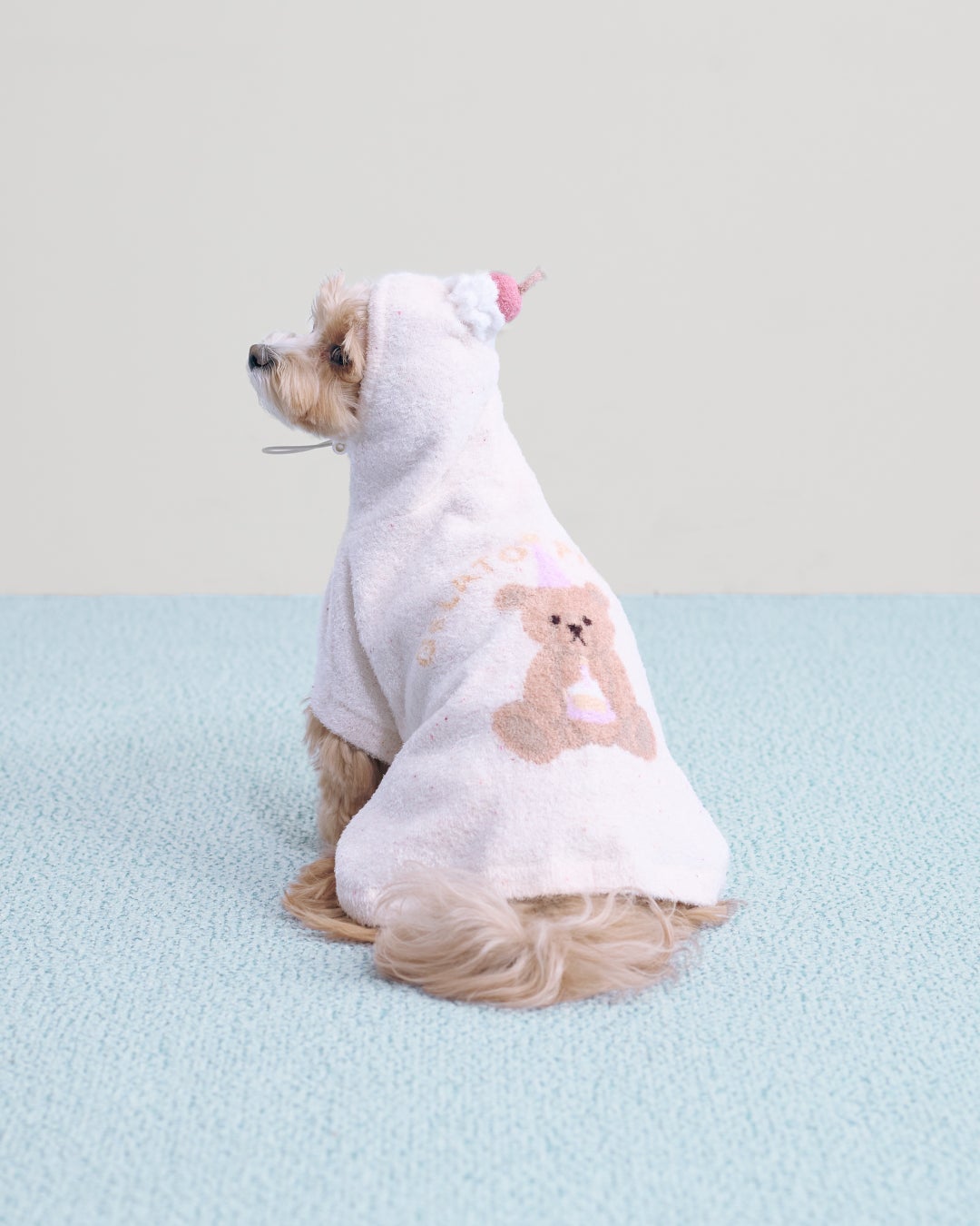 ケープの前面にはブランドロゴを、背面にはバースデーケーキを持ったベアとブランドロゴをジャガードでデザインし、どこから見ても犬猫のかわいさを引き立てます。顔周りのサイズ感は、フードについたドロストコードで調節が可能です。