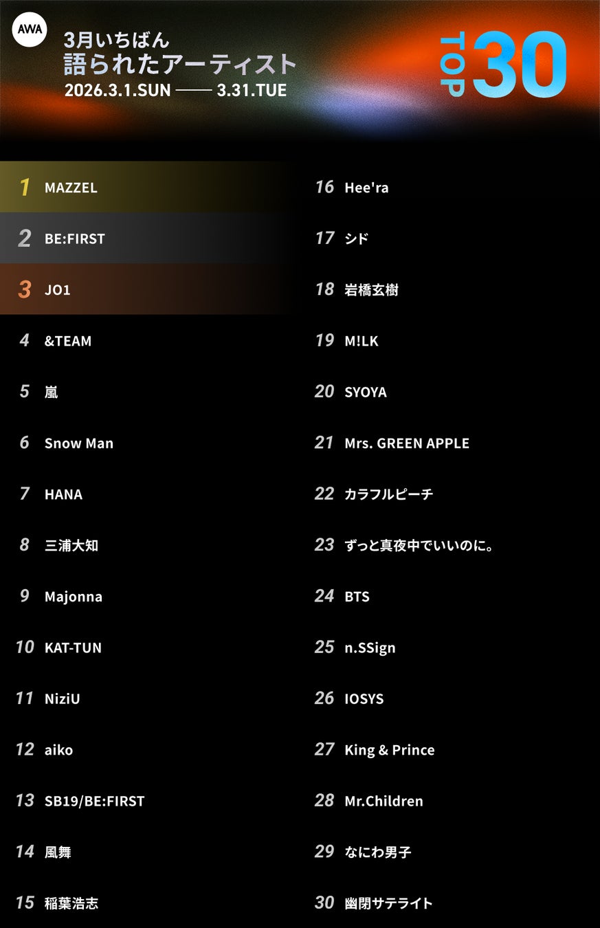 今回は、2026年3月にAWAをご利用いただいたデータを集計し、「プレイリスト入りしたアーティストランキング」「推されたアーティストランキング」「語られたアーティストランキング」「シェアされたアーティストランキング」のTOP30をそれぞれ発表します。