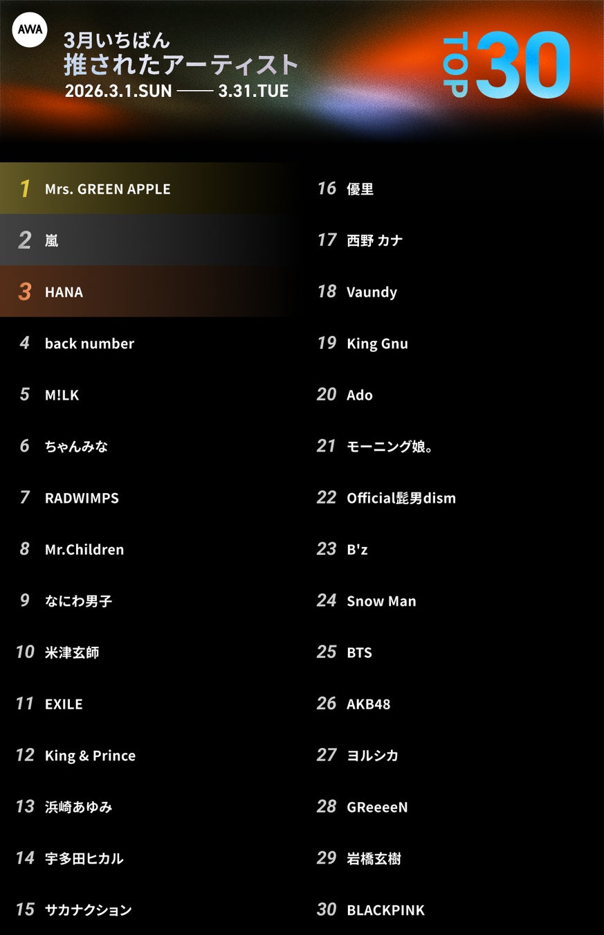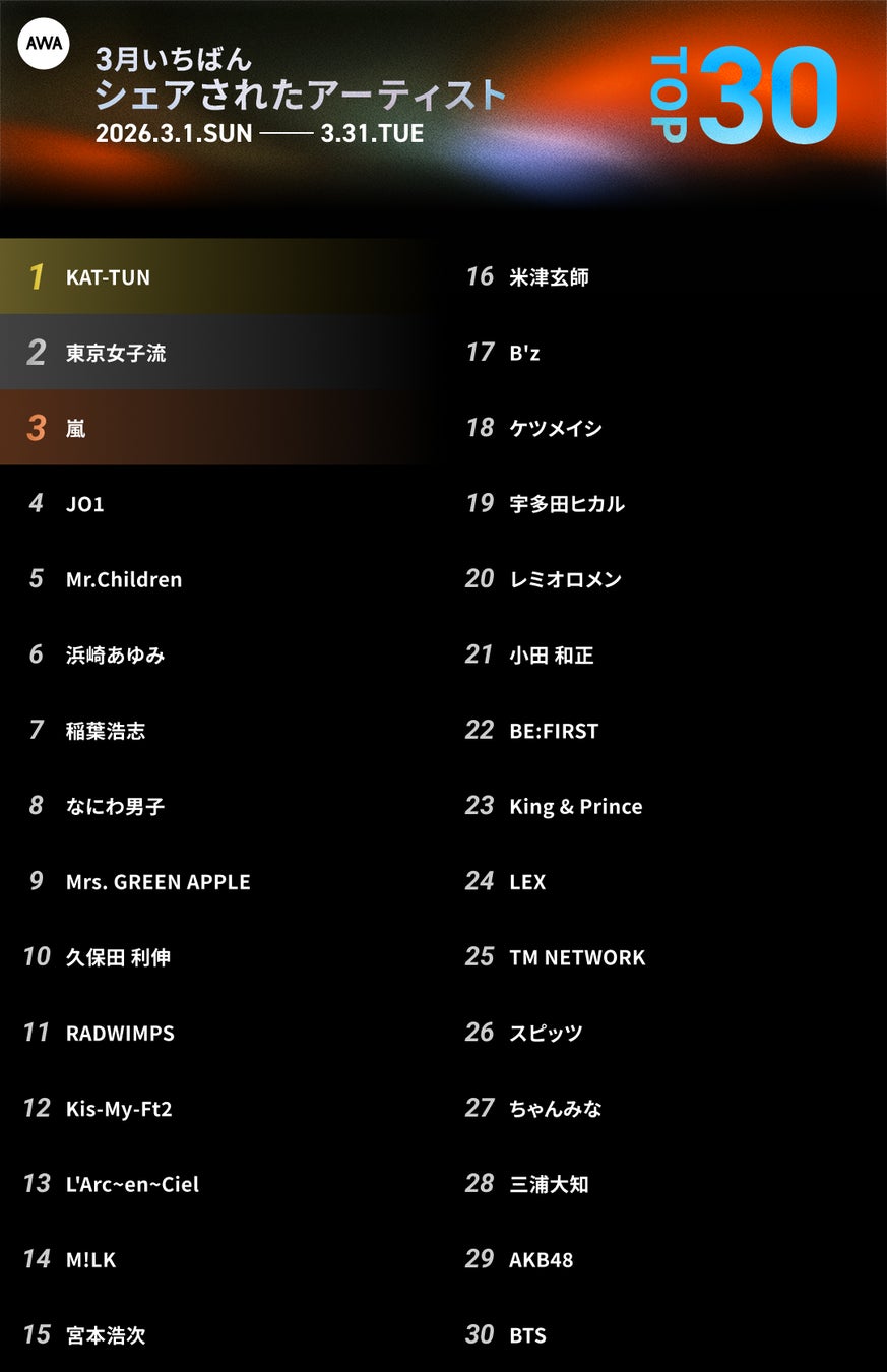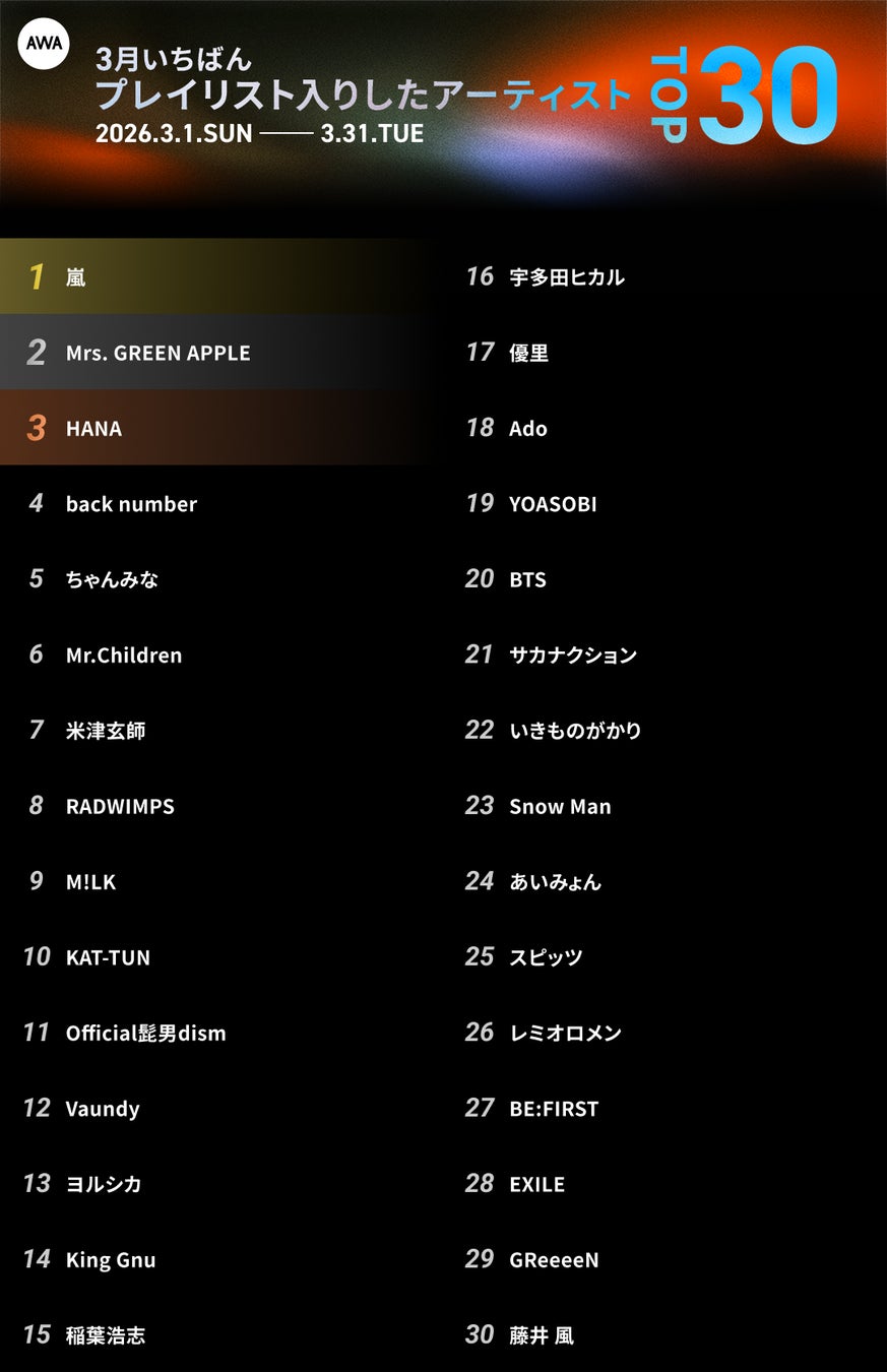 嵐が1位を獲得。3月にAWAユーザーのプレイリストへ最も多く追加され、いま“聴きたい”だけでなく“残したい”アーティストとして強い存在感を見せました。