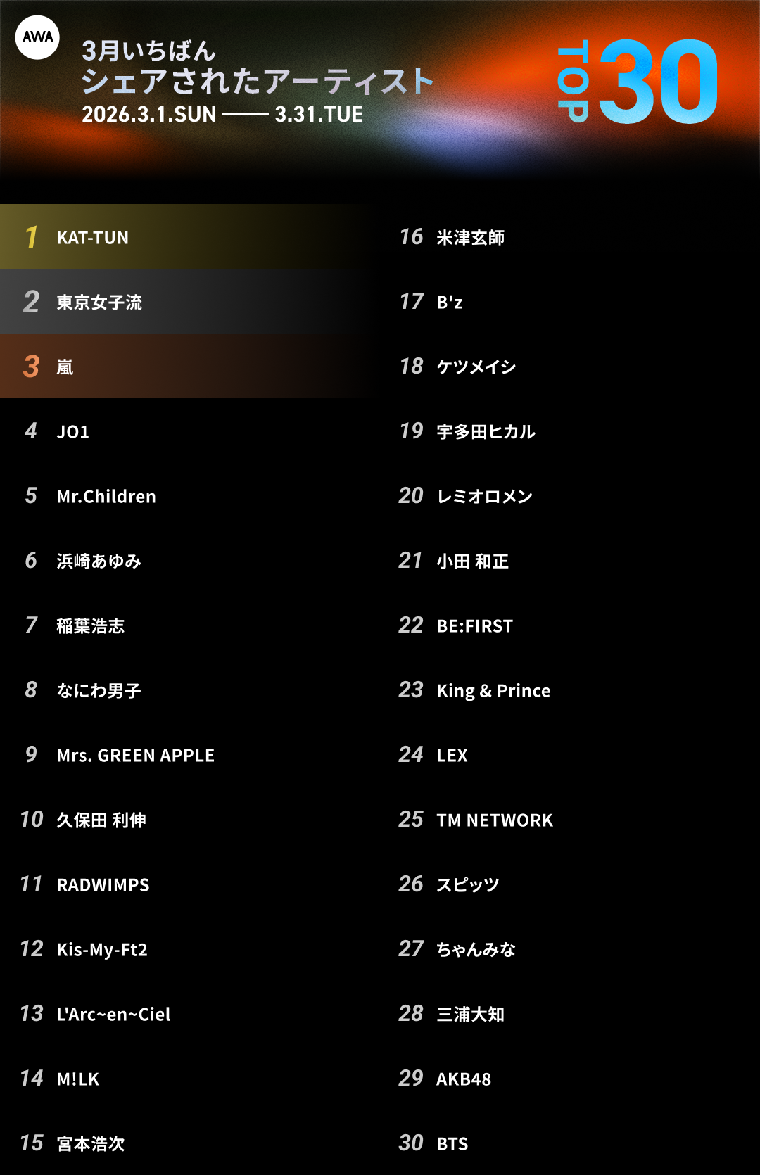 【3月総集編】AWA独自のランキングを公開!!嵐、Mrs. GREEN APPLE、MAZZEL、KAT-TUNらが各部門のトップに