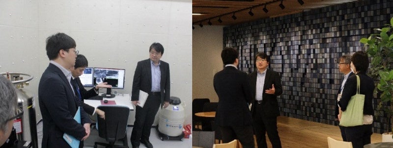 (右写真)共創イノベーションラボ(KIBINOVE)1階のレセプションフロアのラウンジエリアを視察