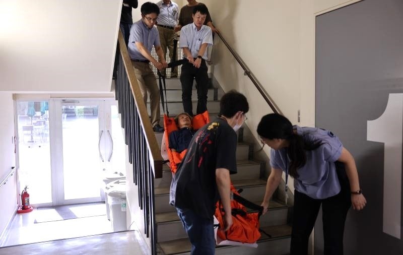 今回の研修は、車椅子ユーザーの学生が今年度中に薬学部の研究室配属を迎えることから、障がい学生支援室に相談しながら薬学部で進めている非常時の避難体制の見直しの一環として企画されたものです。