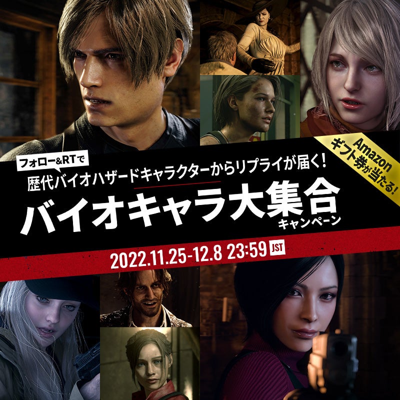 株式会社カプコン(本社:大阪市中央区、代表取締役社長: 辻本春弘)は、ゲームにとどまらない「バイオハザード」ブランドの魅力を伝える「バイオハザード / RESIDENT EVIL PORTAL Official Twitter」において、11月25日(金)より、「バイオキャラ大集合!キャンペーン」をTwitter上で実施します。