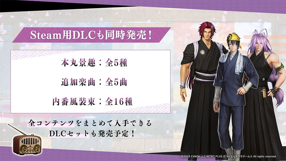 本丸の季節を変えられる「本丸景趣」や、『刀剣乱舞-ONLINE-』で使用されているBGM5曲を本作向けに特別アレンジした「追加楽曲」、さらに刀剣男士の装束が変更できる「内番風装束」などを用意しています。すべてまとめてお得な価格で購入できる「DLCまとめセット」も発売予定です。