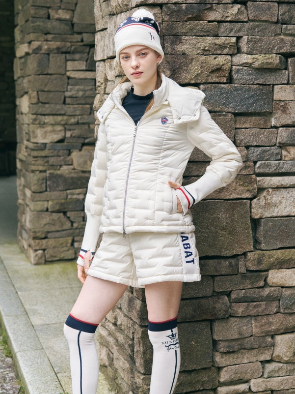 袖口のロングリブが見た目の美しさとスイングのしやすさを兼ね備えたダウンアウターです。フードは着脱可能です。