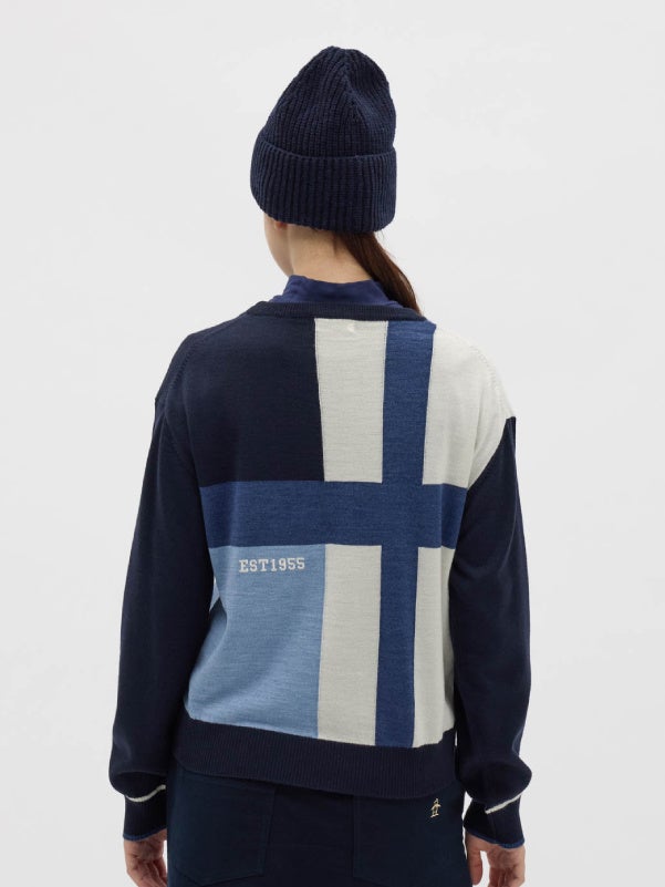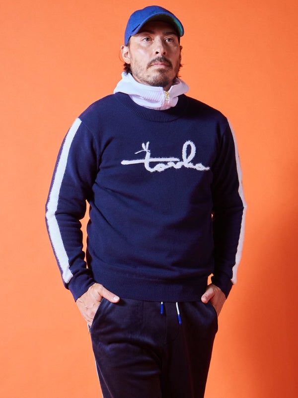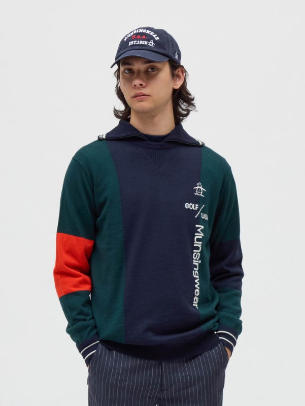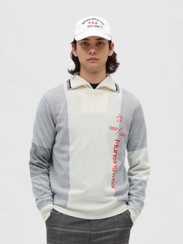 機能性とデザイン性を兼備したクルーネックセーター。ブロッキング風の配色にインターシャでロゴを表現。インナーには防風素材を採用し、裏地は脱着可能なセパレート仕様です。