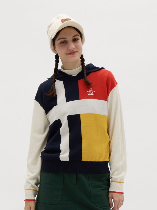 ウールとアクリル糸を使用した、インターシャ編みのパネルブロックデザインセーターです。防風インナーがセットになっており、セーターの弱点である風の侵入を防ぎます。インナーは他のセーターとの組み合わせも可能です。