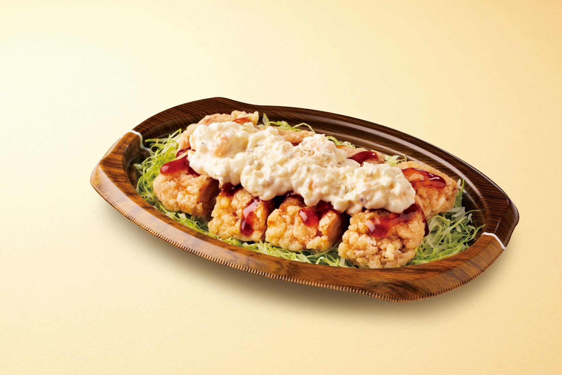 衣サクサクでジューシーに揚げた鶏もも肉を、すっきりした後味に仕立てた甘酢ソースと、酸味を抑え玉子感を楽しむタルタルソースでお召し上がりください。