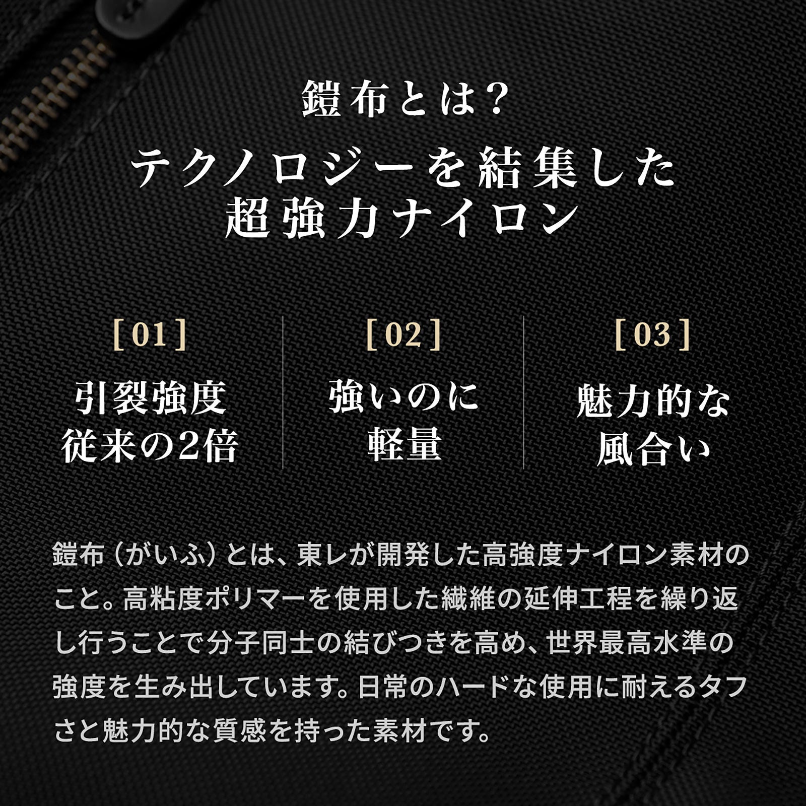 本製品は、東レの「鎧布」を使用し、豊岡で製作した日本製のショルダーバッグです。東レ「鎧布」は、高粘度ポリマーを使用し先端テクノロジーから生まれ、世界最高水準の超高強力生地です。鞄製作の一大産地となる兵庫県豊岡で縫製をしています。