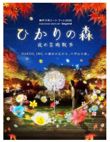 夜間限定の光のアート作品が、ROKKO森の音ミュージアムと六甲高山植物園を幻想的に彩ります。また、会場に設置された作品が光に照らし出され、昼間とは違った表情をお楽しみいただけます。10月中旬~11月中旬には、ライトアップされた木々の紅葉もお楽しみいただけます。