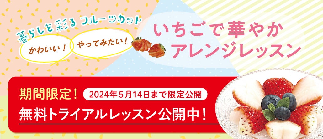 ミニツクオンラインのトップページにある以下のバナーから専用ページへログインするだけで「いちごで華やかアレンジレッスン」のトライアルレッスン動画が無料視聴できるキャンペーンを実施中です。(※フェリシモIDとパスワードでログインできます)期間は4月15日~5月14日まで。