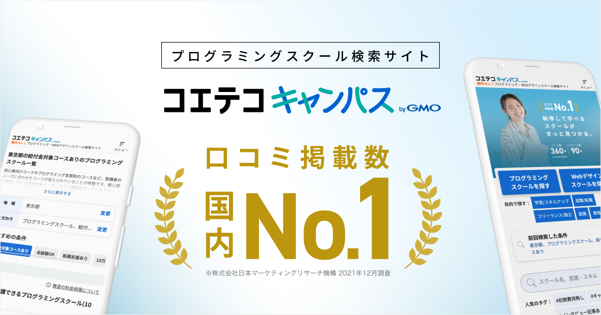 GMOインターネットグループのGMOメディア株式会社(代表取締役社長:森 輝幸 以下、GMOメディア)が運営する、社会人と大学生の学びを応援するプログラミングスクール検索サイト「コエテコキャンパス byGMO」(URL:https://coeteco.jp/campus)は、株式会社日本マーケティングリサーチ機構(代表取締役:一戸 剛)が2021年12月に行った調査で、口コミ掲載数が779件となり、国内の社会人向けプログラミングスクール検索サイトにおいてNo.1を獲得したことをお知らせいたします。