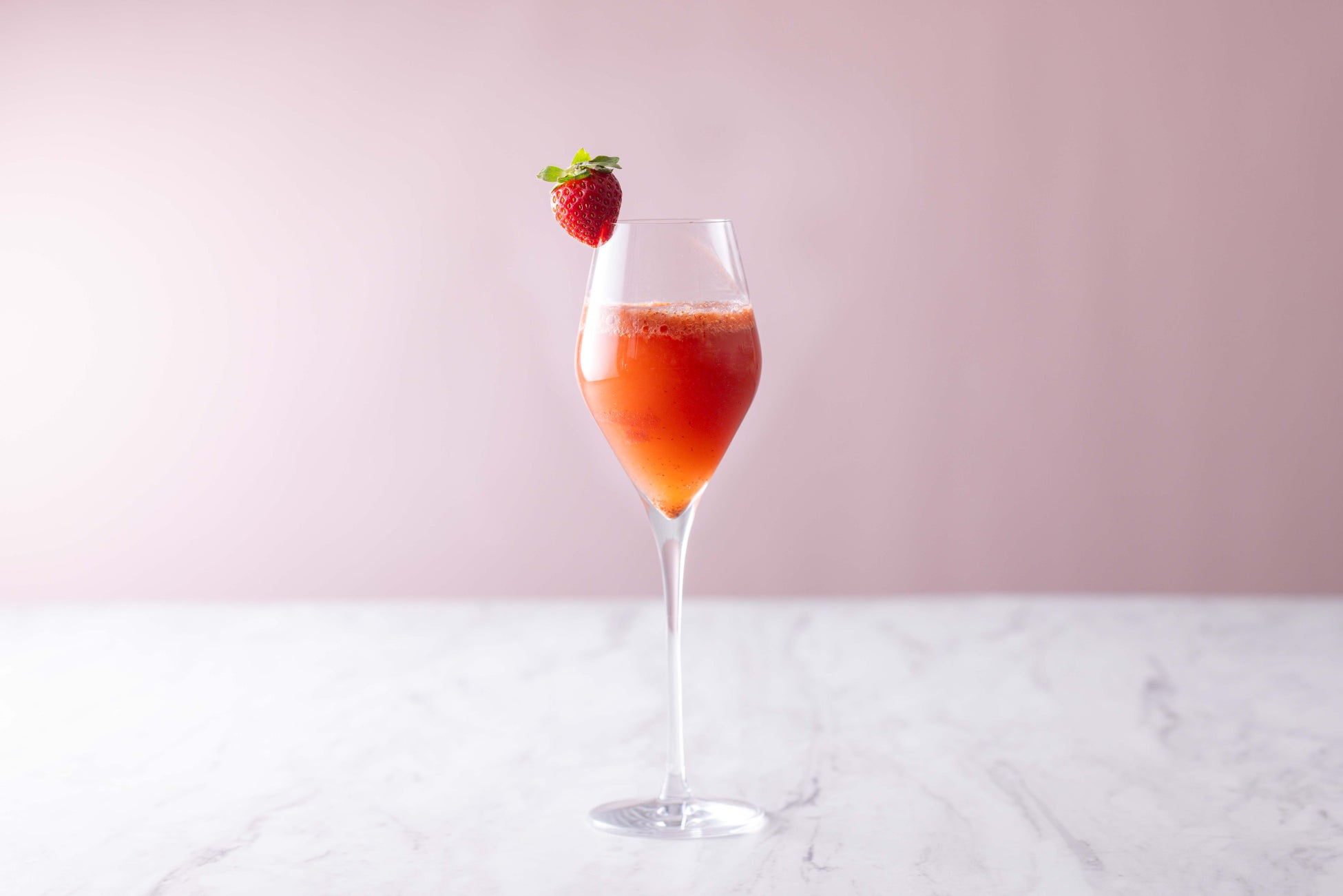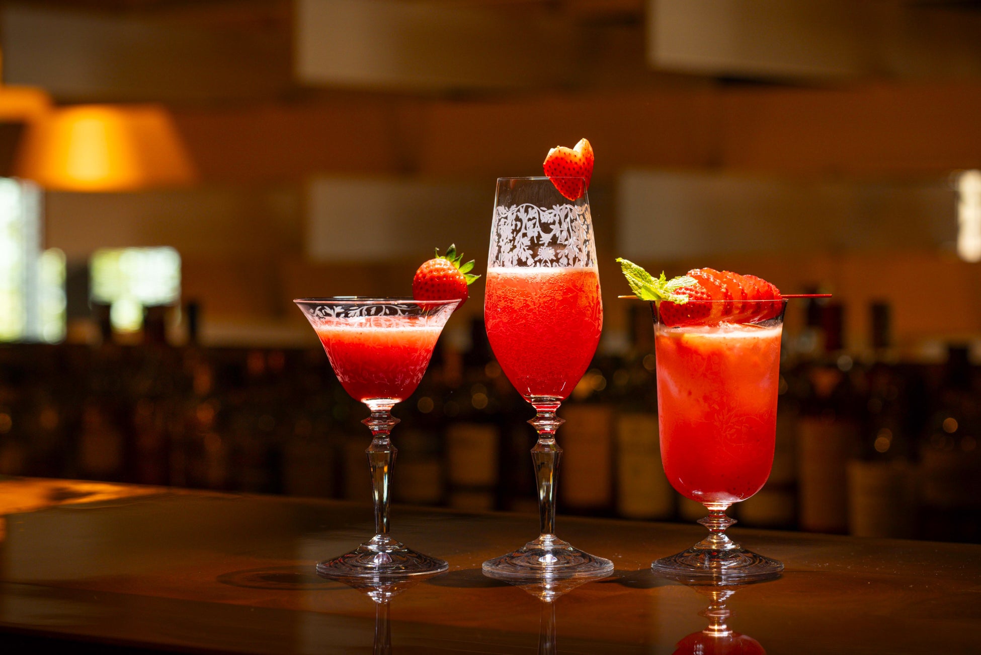 フレッシュな苺をふんだんに用いた季節のカクテルが、冬の夜を明るく彩ります。「ストロベリーマティーニ」、「ストロベリーシャンパン」、白ワインとソーダが爽やかな新作「ストロベリースプラッシュクーラー」をラインアップ。芳醇なシャンパンと苺が出逢うカクテルには、可憐なハート型の苺が寄り添います。