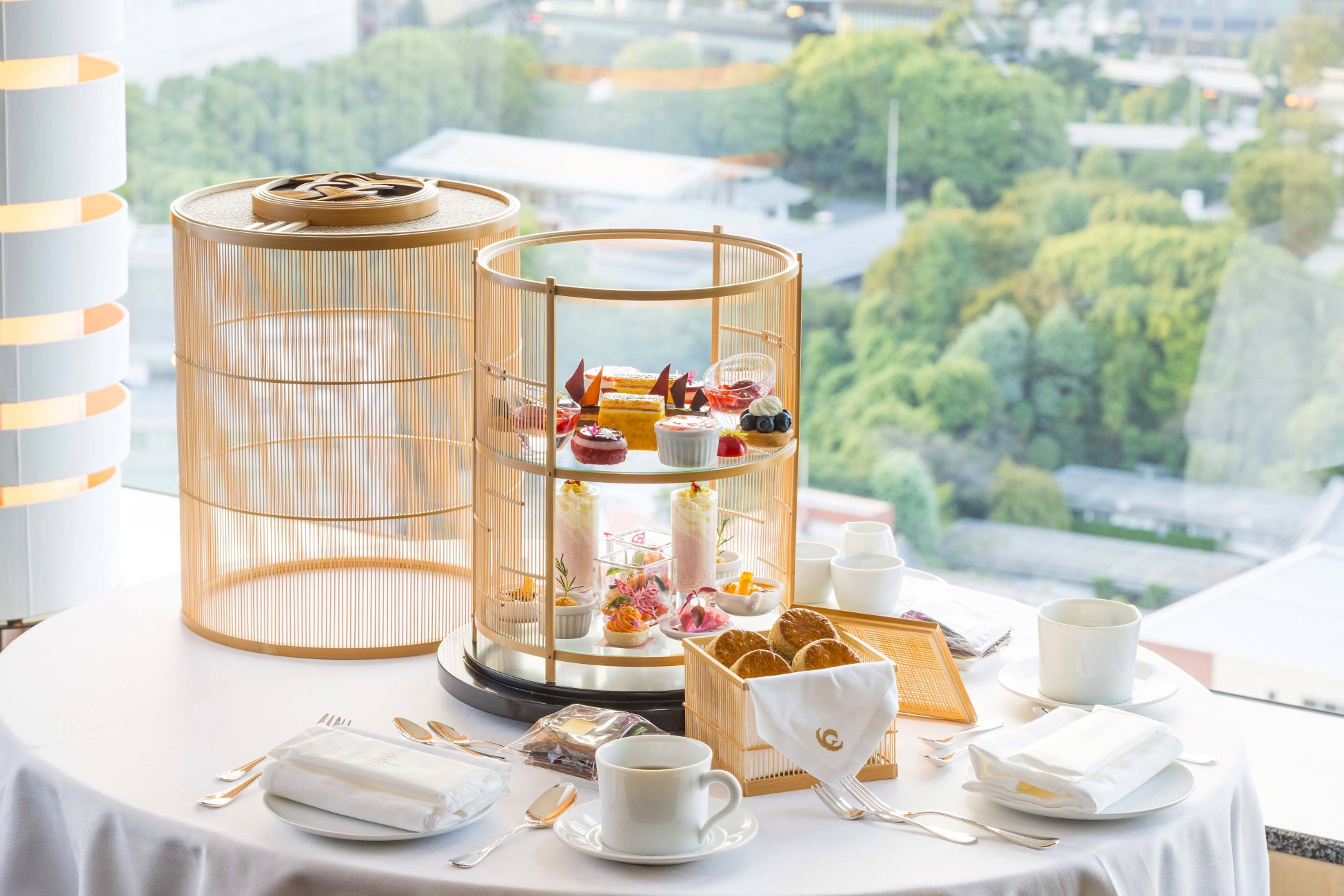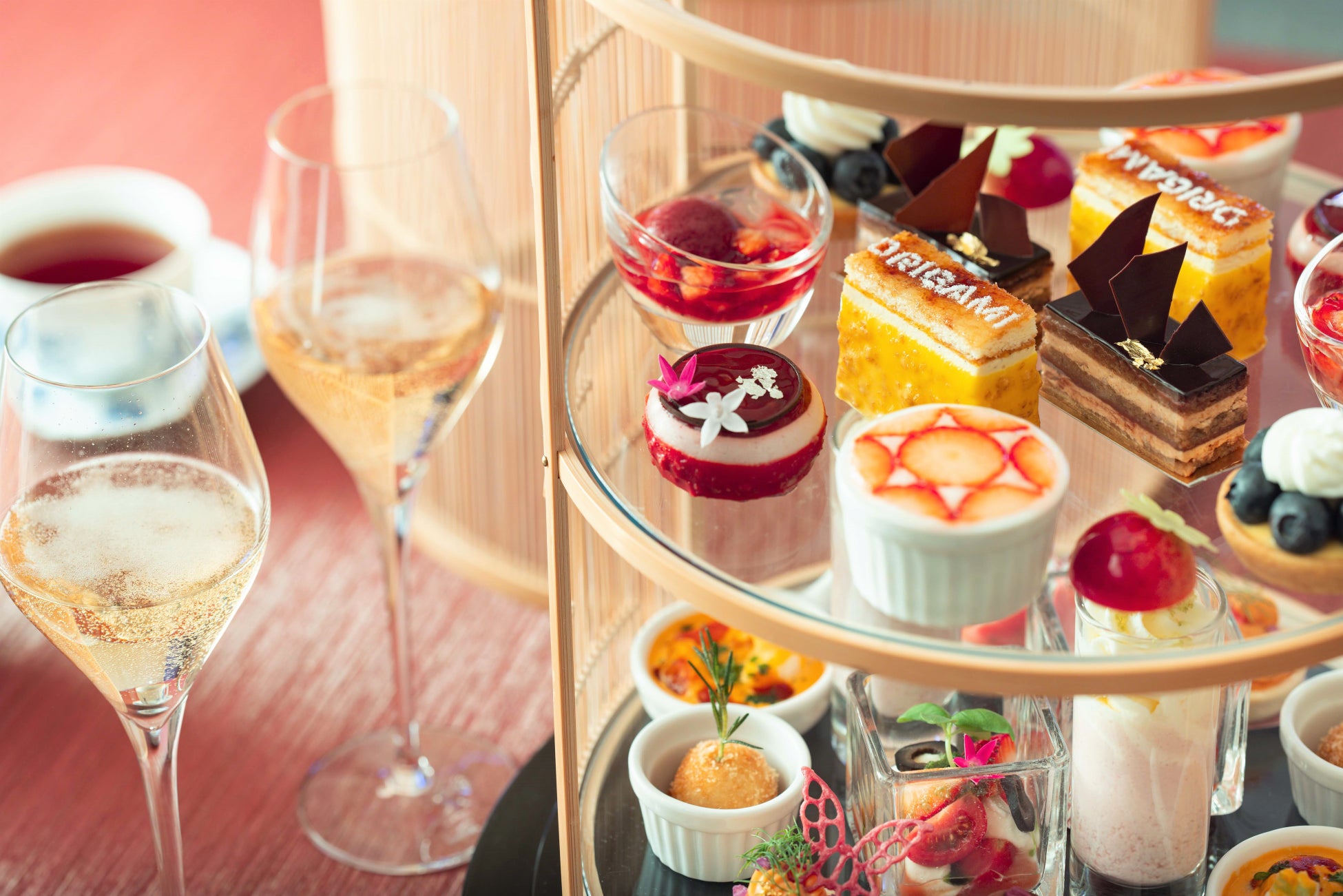 ラウンジ「ORIGAMI」で人気の春の「ザ・キャピトル アフタヌーンティー」をお部屋にご用意いたします。季節によりラインアップが変化するセイボリー&スイーツが、優美なオールハンドメイドのティースタンドに愛らしく並びます。繊細な蓋の上部には水引の淡路結びをあしらい、末永くお客さまに愛していただけるようにとの願いを込めました。