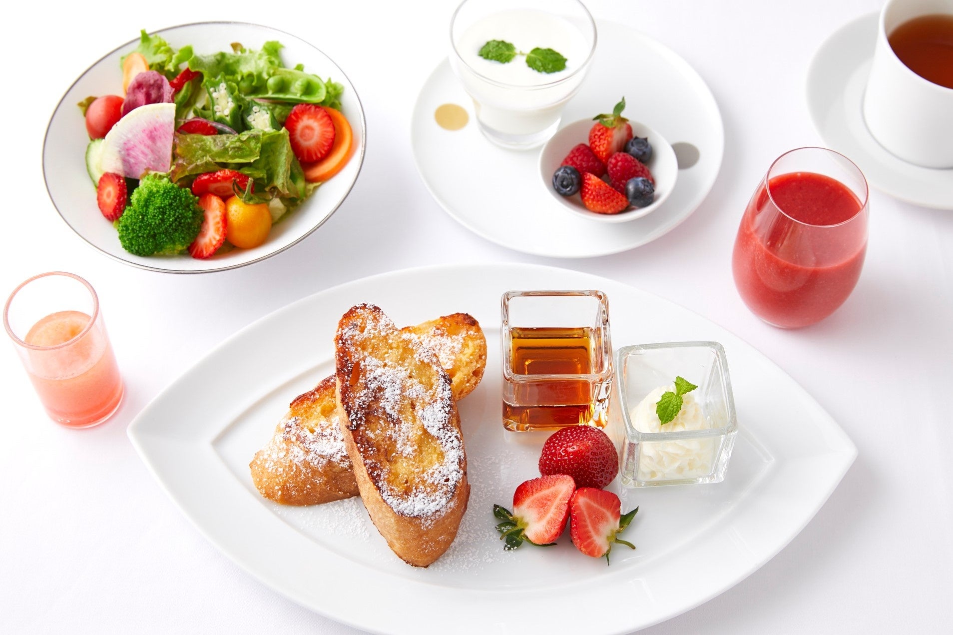 苺のサラダ、フレッシュジュースのほか、表面は芳ばしく中はしっとり焼き上げたフレンチトーストのご朝食をお部屋にお届けいたします。苺の朝食が楽しめるのはルームサービス限定。窓から一望する都心の景色とともに、苺の香りに包まれる優雅な一日のはじまりをお過ごしいただけます。