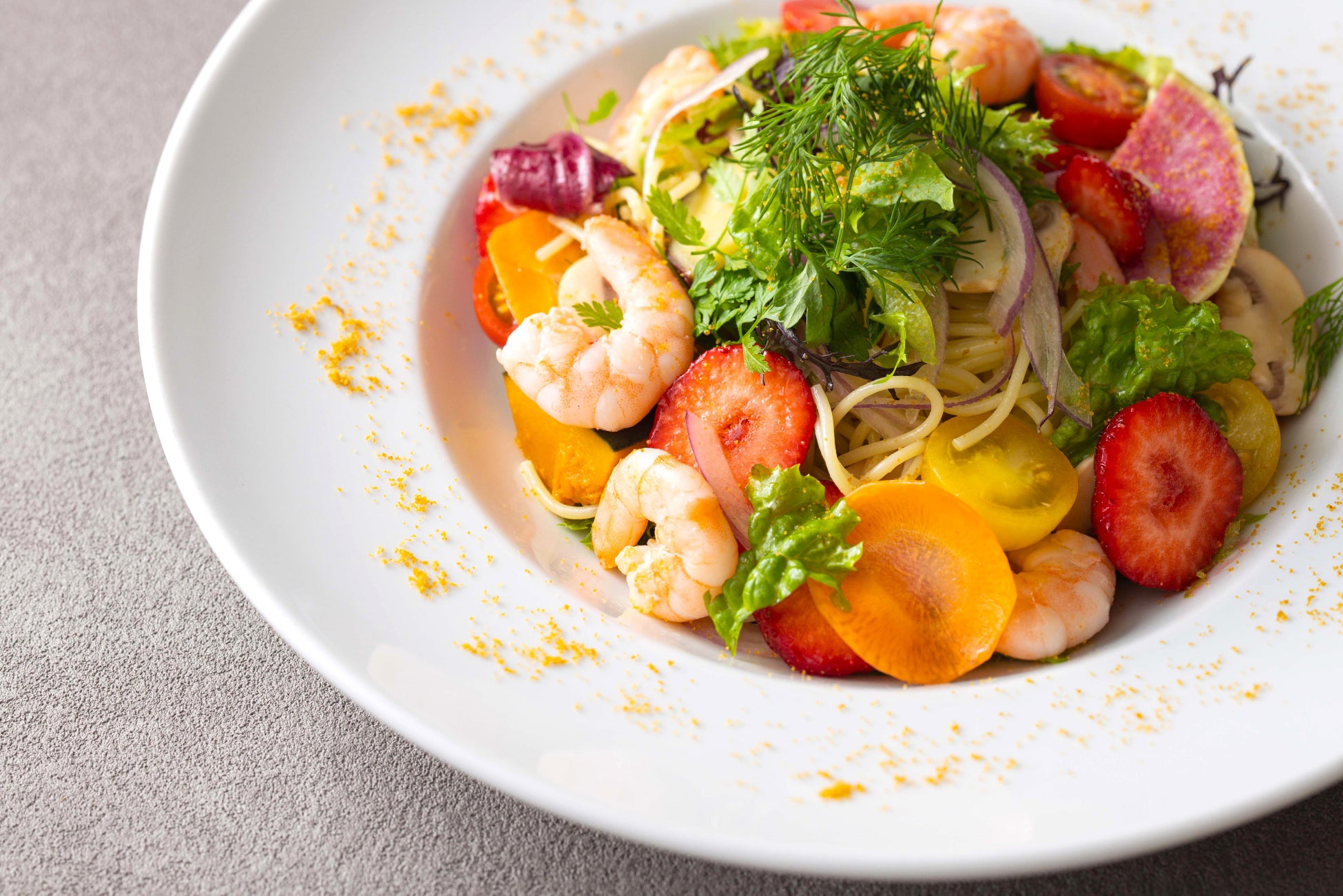 苺と海老のスパゲッティ カラスミの香り または 苺とシーフードの彩りカレーライス