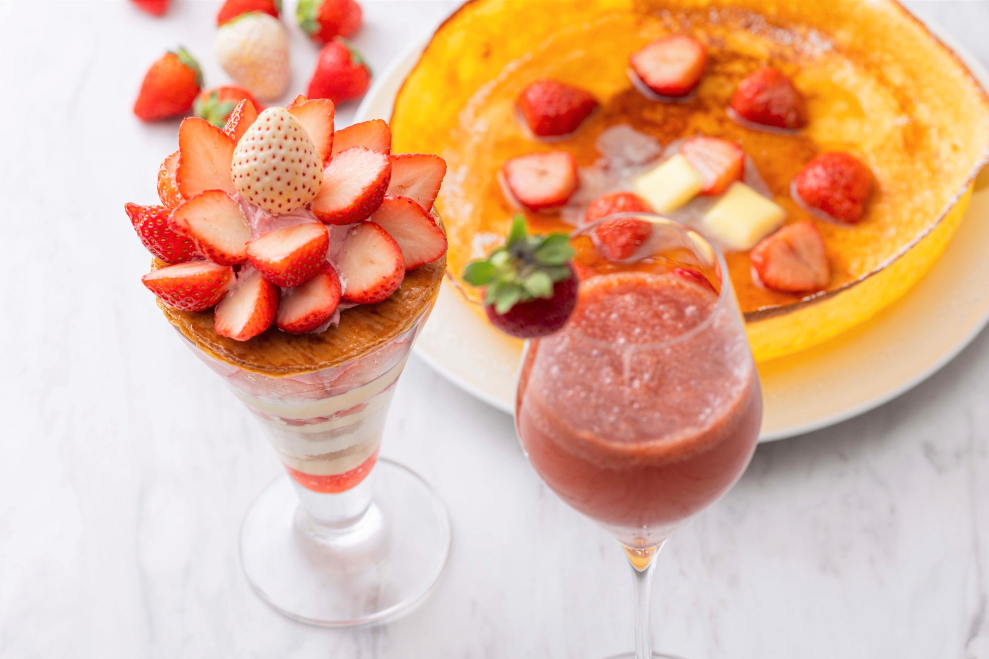苺をふんだんに使用したシェイクやアイスクリームなどが揃います。ほんのり甘くさわやかに香る、苺のスイーツ&ドリンクでゆったりとしたティータイムをお届けいたします。