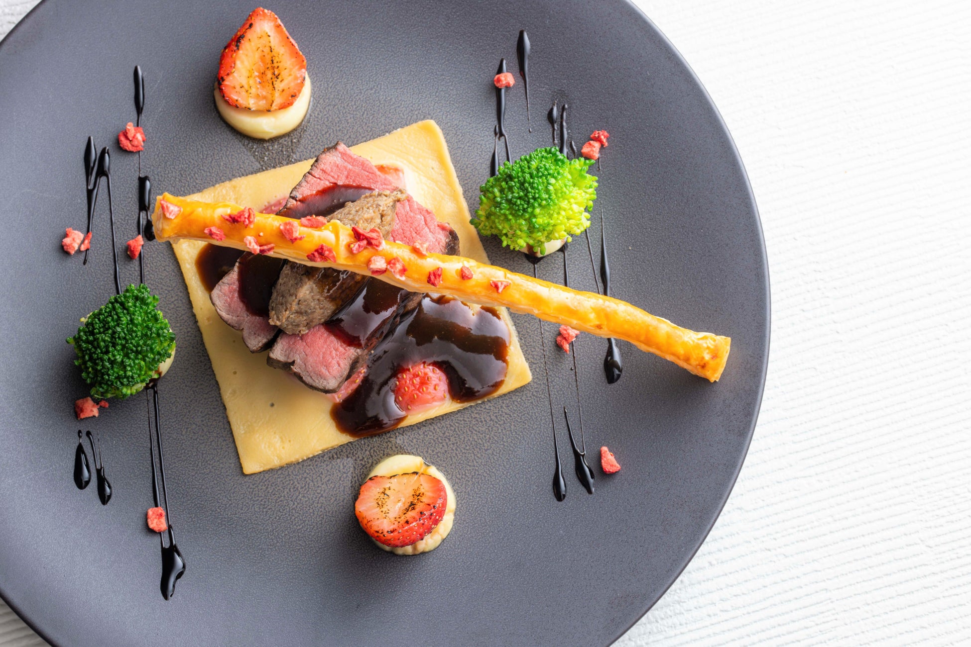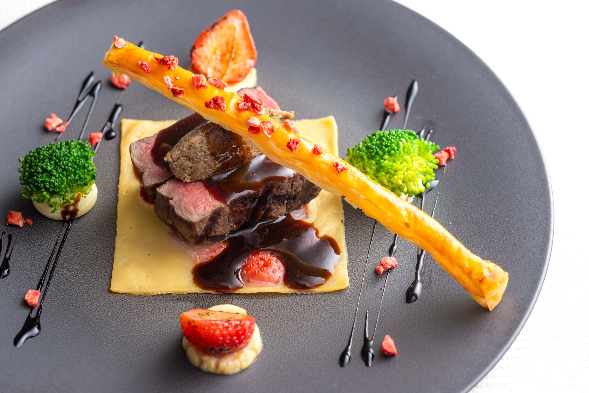 国産牛フィレ肉のグリル シャンピニオンデュクセル トリュフ香るマデラソースと苺の絨毯とともに