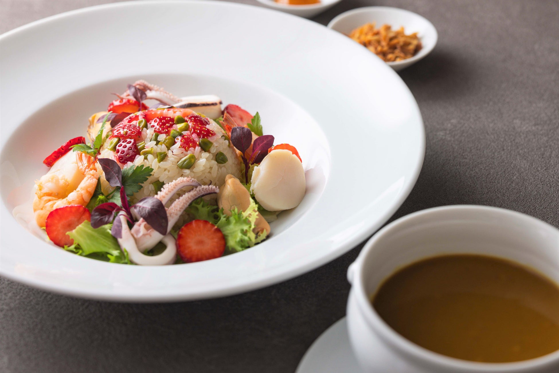 前菜からメインディッシュ、デザートに至るまで苺を取り入れた見目麗しいメニューをご用意。苺とトリュフが香るマデラソースとあわせた国産牛フィレ肉のグリルを含むディナーコース、苺と魚介を合わせた彩り豊かなパスタやカレーをメインとしたランチセットと、美味しさだけでなく意外な苺の魅力に触れることができるメニューをご用意いたします。