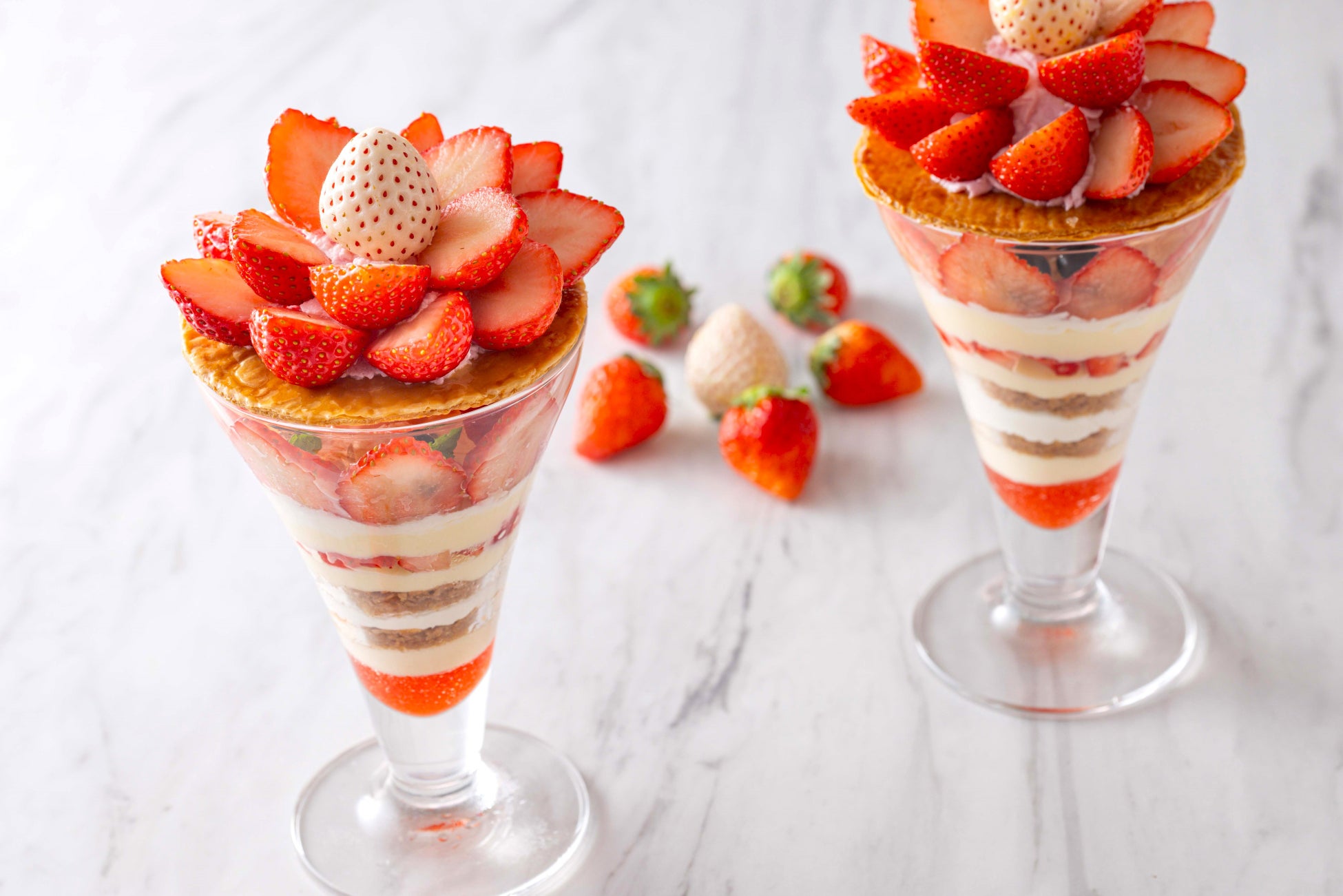 旬のフレッシュ苺をふんだんに使った、赤と白のコントラストが映えるパフェは、ベリーや苺のソース、生クリームが美しく層になり、甘さと酸味、塩味のバランスが絶妙な一品に仕上げました。トップは、サクサクのパイ生地の上に贅沢にあしらった赤と白の苺が華やかに彩ります。ティータイムだけではなく、ディナーのあとの“締めパフェ”としてもお愉しみいただけます。