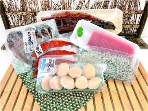 (アジの開き4枚、鮭切身3切、しらす1パック、うなぎ1尾、めばちまぐろ1作、ホタテ貝柱1パック)