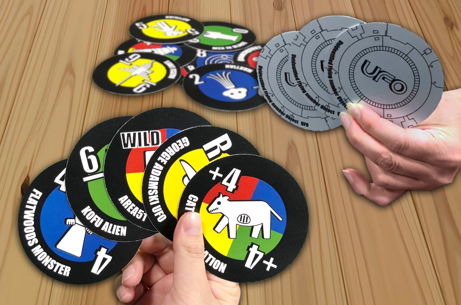 宇宙人からの侵略を阻止するために、いち早く持ち札の円盤型カードをなくし、迫りくる宇宙人を撃退したプレイヤーが勝ちとなります。