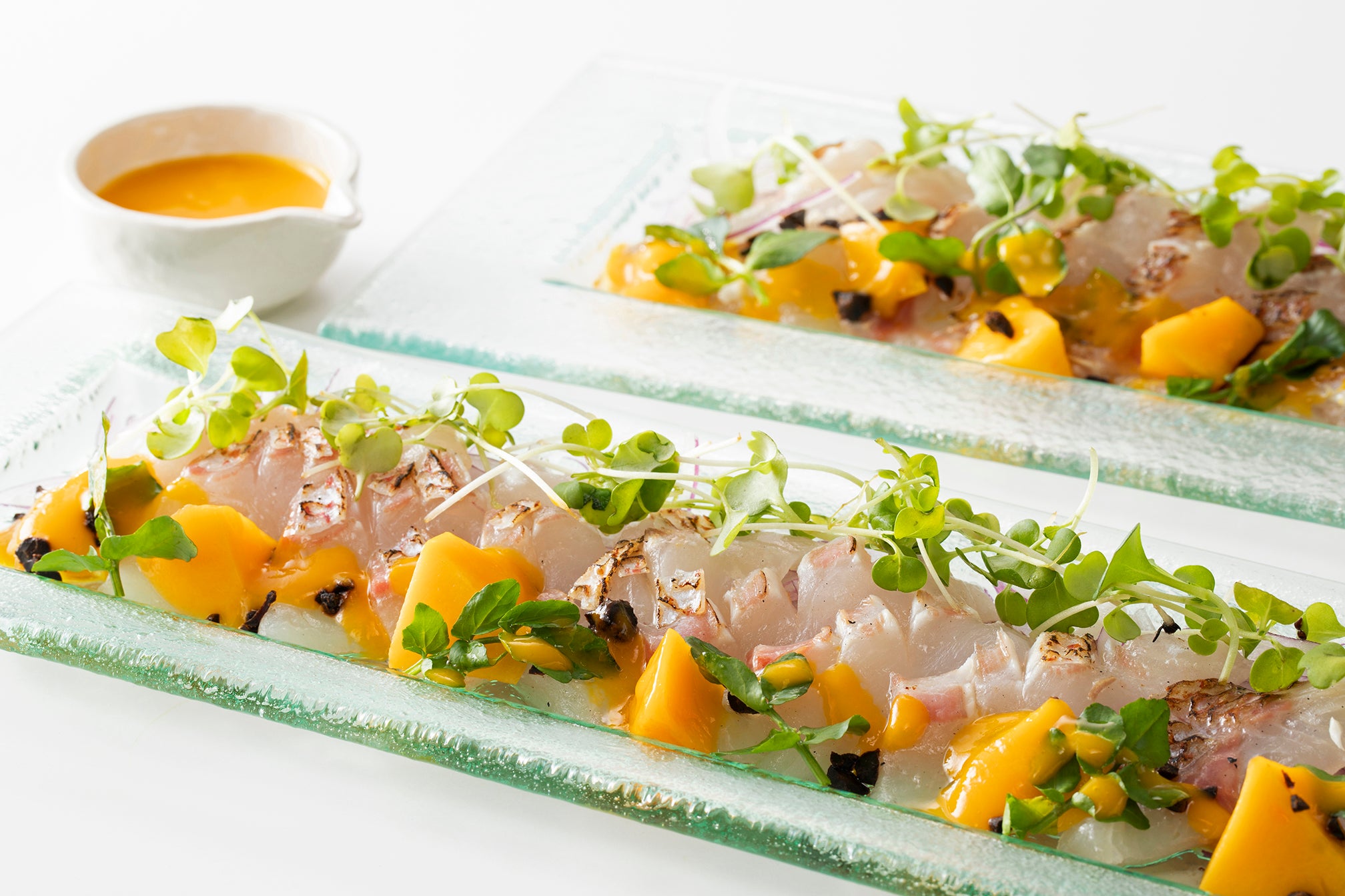 ・紀州梅まだいの炙りカルパッチョ マンゴーと豆鼓のソース