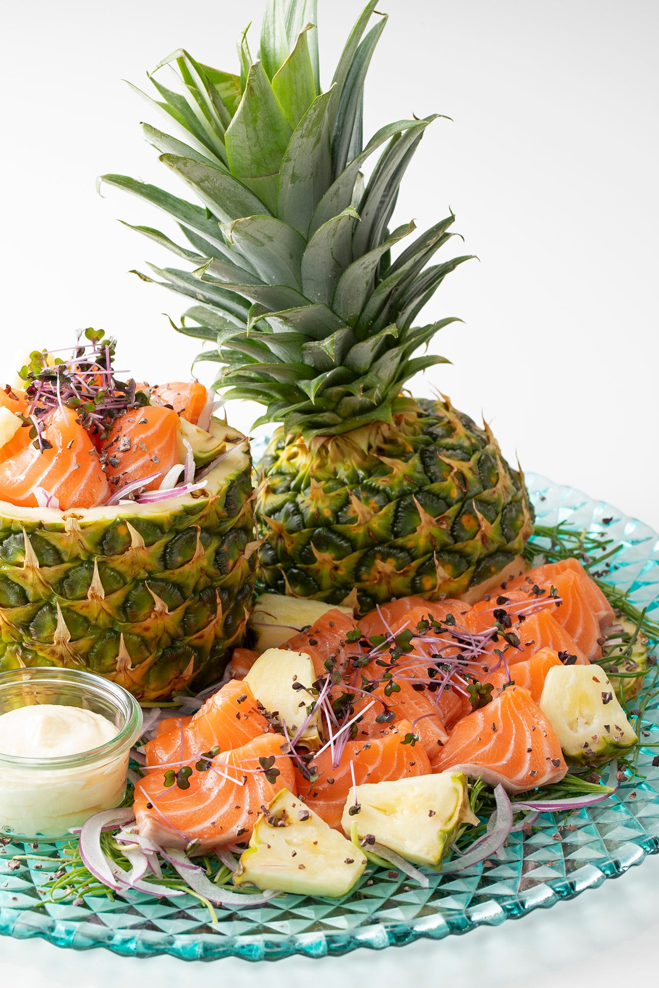 ・パイナップルの器に入れた サーモンマリネとオニオンのサラダ仕立て