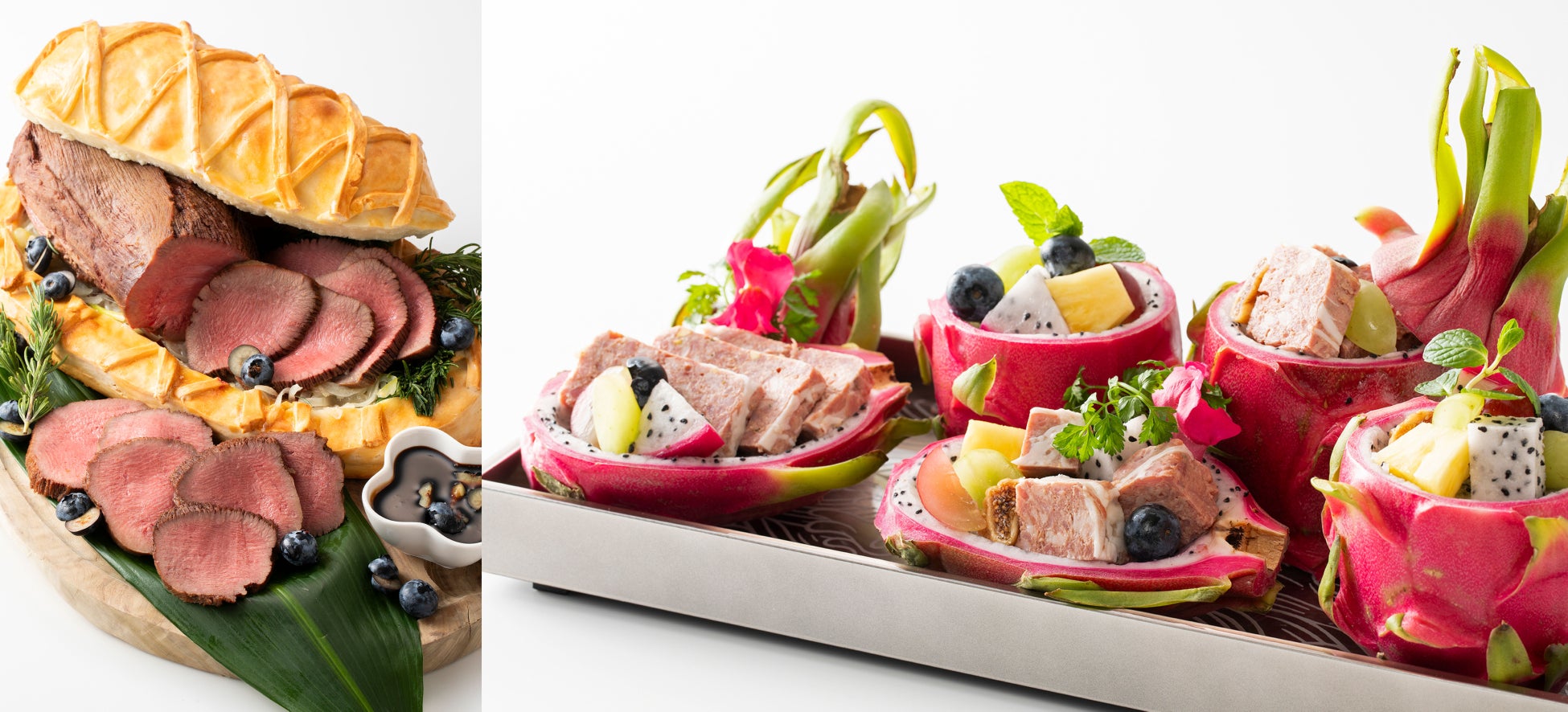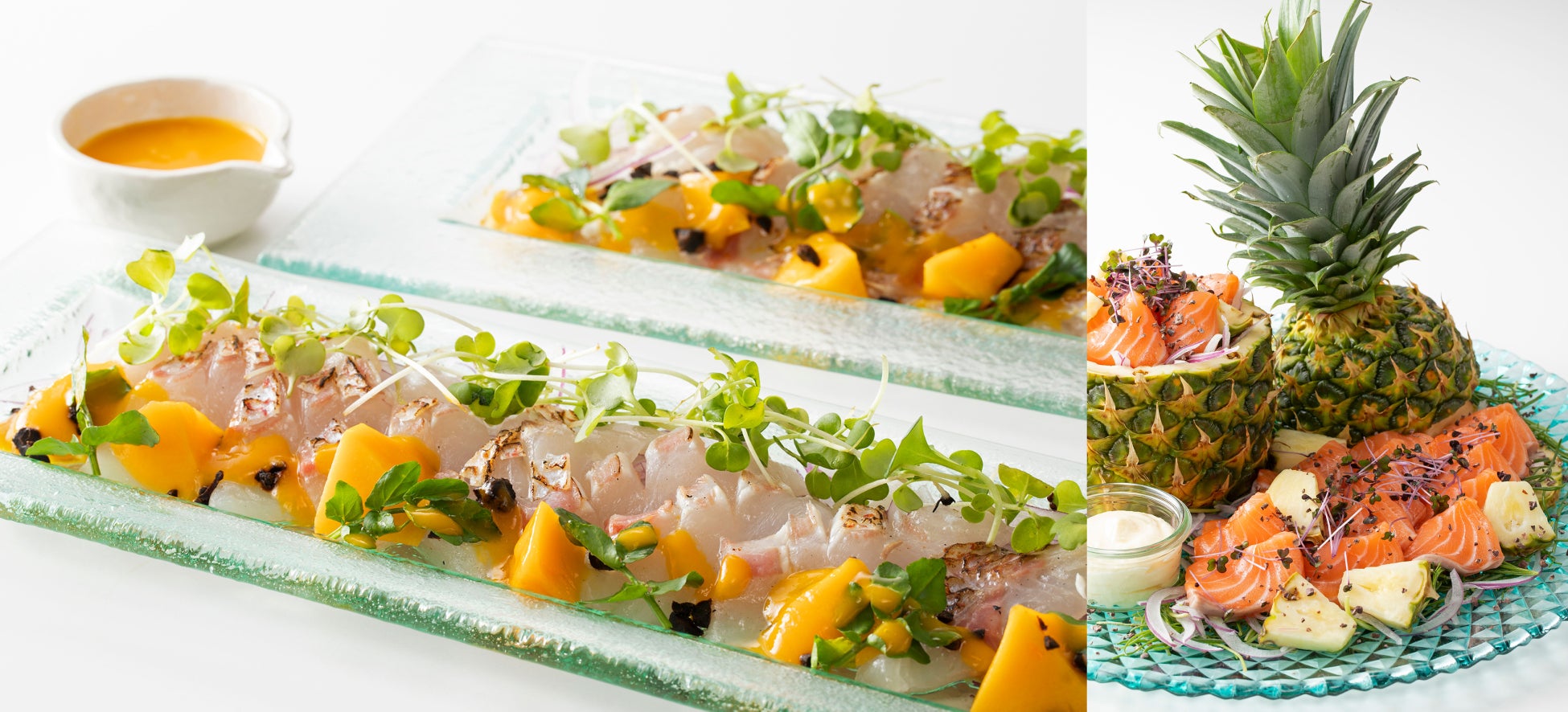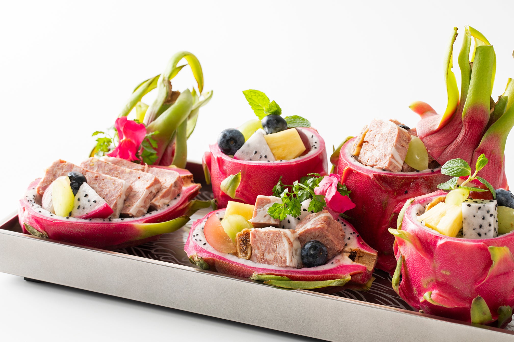 「フルーツとシーフード」がテーマの6月は、見た目も華やかで豪快な「パイナップルの器に入れた サーモンマリネとオニオンのサラダ仕立て」や和歌山県の特産品である梅を活用した地産フルーツ魚を使用した「紀州梅まだいの炙りカルパッチョ マンゴーと豆鼓のソース」などをご用意いたします。「肉料理とフルーツ」がテーマの7月は、「牛タンの塩生地包み ブルーベリーソース」やカラフルな見た目が写真映えする「パテドカンパーニュとフルーツのマリネ ドラゴンフルーツの器に入れて」などフルーツと食材のマリアージュをお楽しみいただけます。