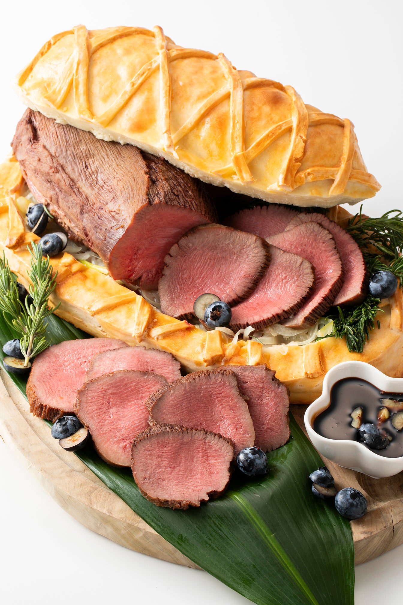 ホタテとマンゴーの包み焼き 鶏のジュのソース/ブルーベリーでマリネしたスペアリブのロースト/国産牛もも肉のローストビーフ&ミニビーフステーキ