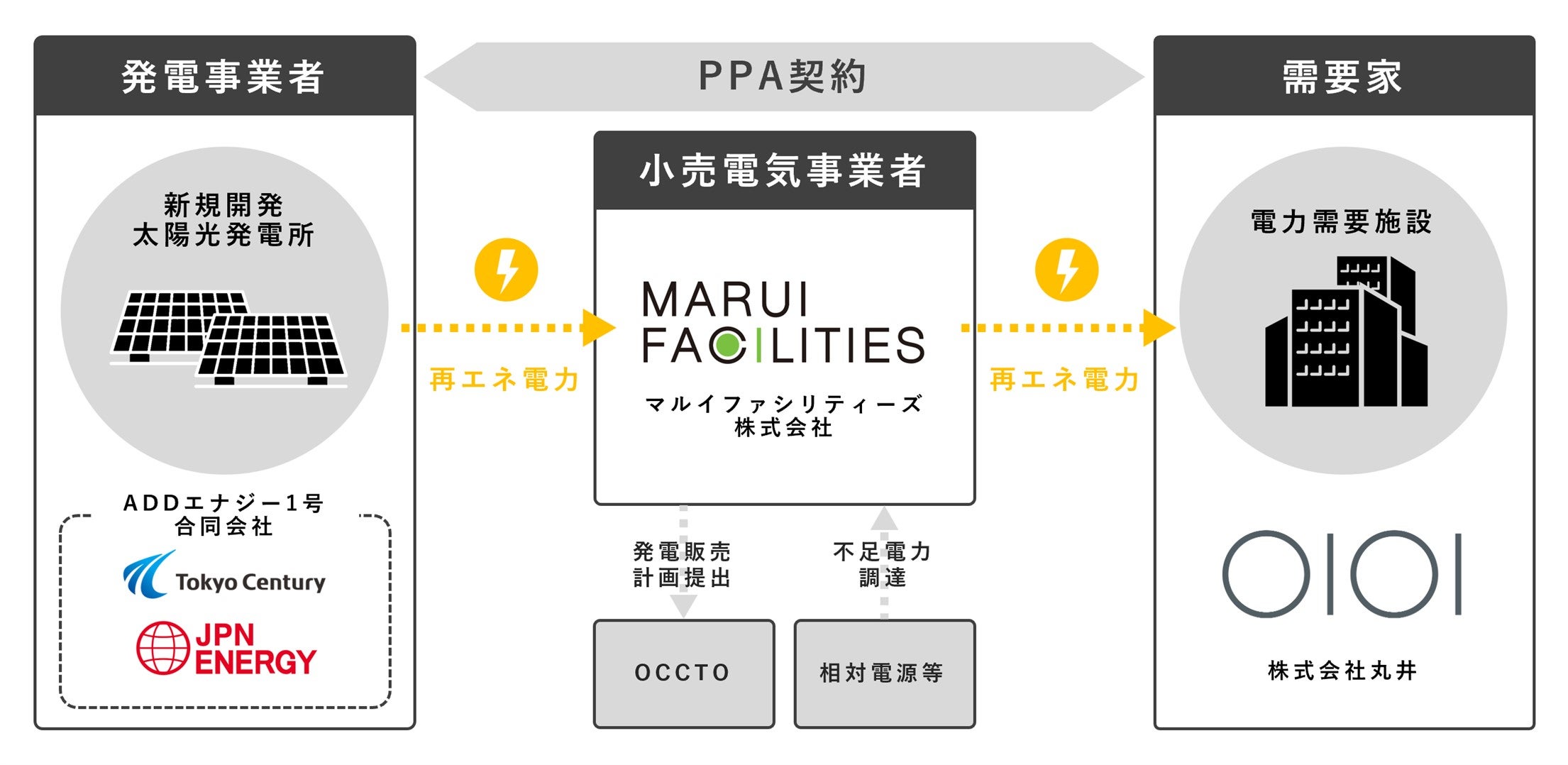 JPNと東京センチュリーが設立したADDエナジー1号合同会社(以下「ADD1号」)が新たに開発する合計出力容量約3,700kWの中小型太陽光発電所から発電される再エネ電力を、マルイファシリティーズを通じて丸井が所有する柏モディなどの需要施設に供給する事業です。なお、経済産業省が実施する「需要家主導による太陽光発電導入促進補助金」※2の採択を受けて実施し、ADD1号のアセット・マネジメントは東京センチュリー子会社のA&Tm株式会社が担います。